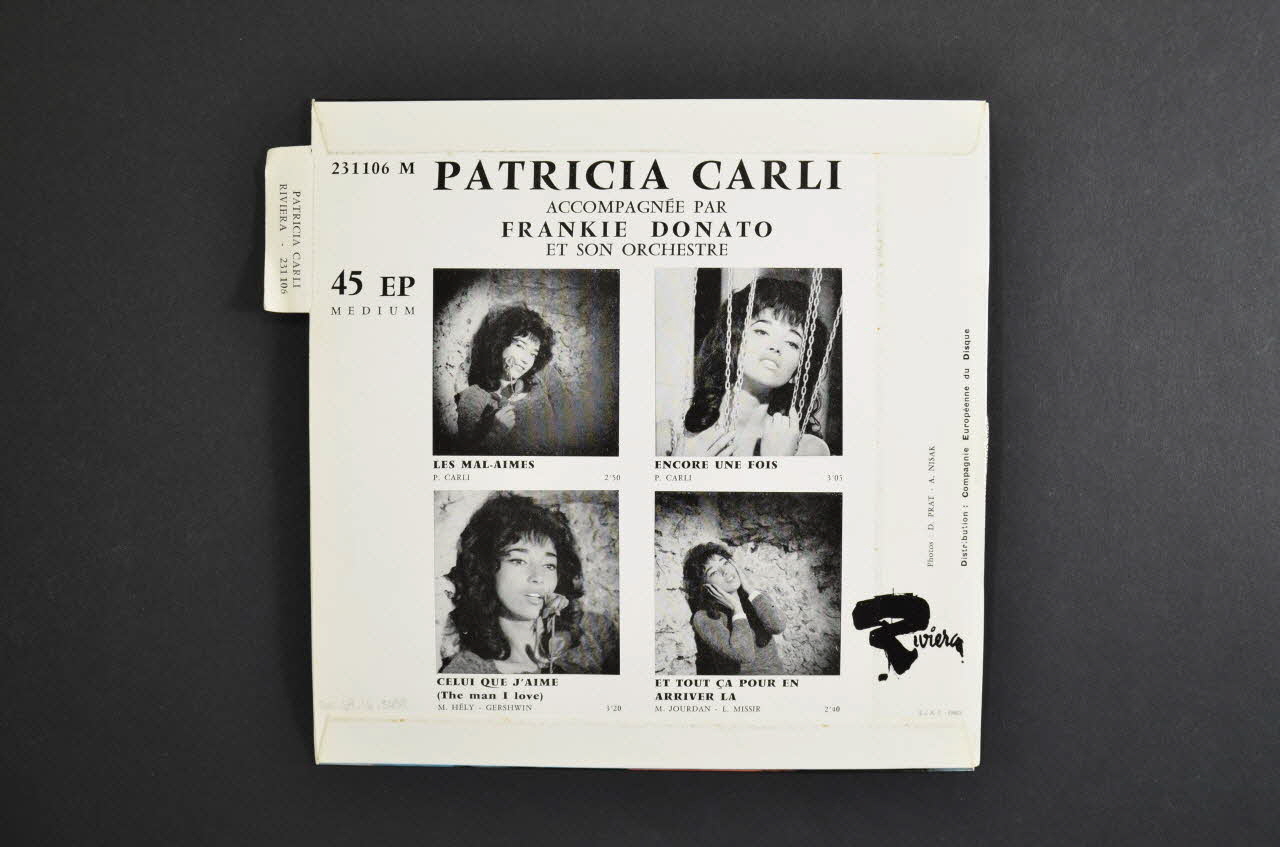 Au recto le fond représente la photo, en couleur, du portrait de la chanteuse. En haut, figurent, sur un bandeau noir horizontal, des inscriptions en bleu, jaune et blanc. Au verso, le fond est blanc avec des inscriptions noires et quatres photos en noir et blanc de pochettes de disque.Matériaux et techniques
