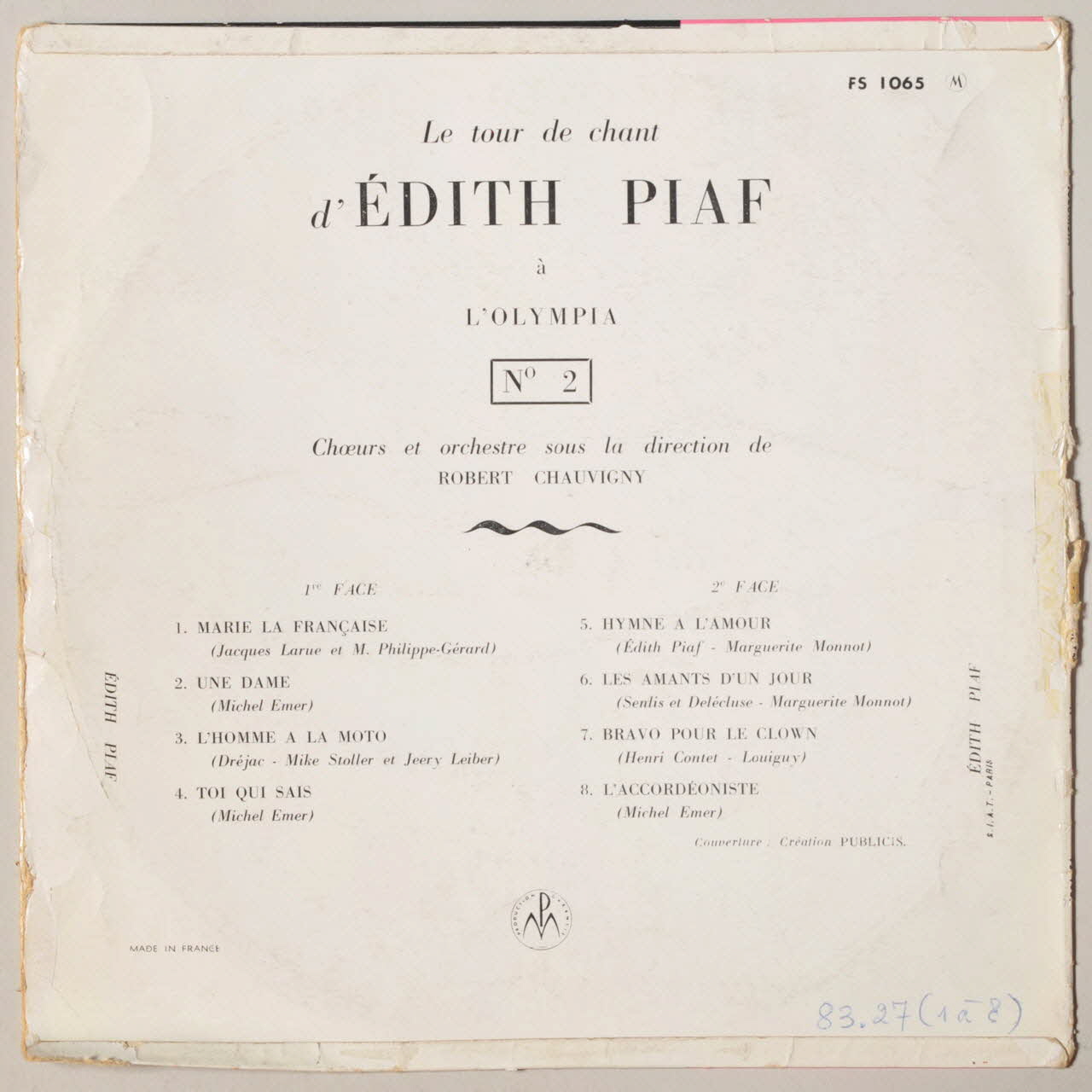 disque 33 tours, Toi qui sais, Marie la française, Hymne à l'amour, Bravo pour le clown, Le tour de chant d'Edith Piaf, Les amants d'un jour, Une dame, L'accordéoniste, L'homme à la moto