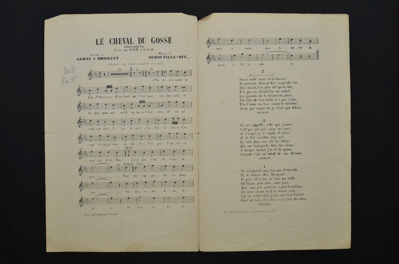 Sur la couverture, la représentation du chansonnier Polin en tenue militaire, en pieds, levant la main gauche ; à droite, un petit cheval de bois à roulettes. Les inscriptions renseignent le titre de la chanson, le nom des auteurs, de l'artiste et de l'éditeur. A l'intérieur, partition et paroles de la chanson. Au dos, liste d'autres partitions publiées par l'éditeur.Décor