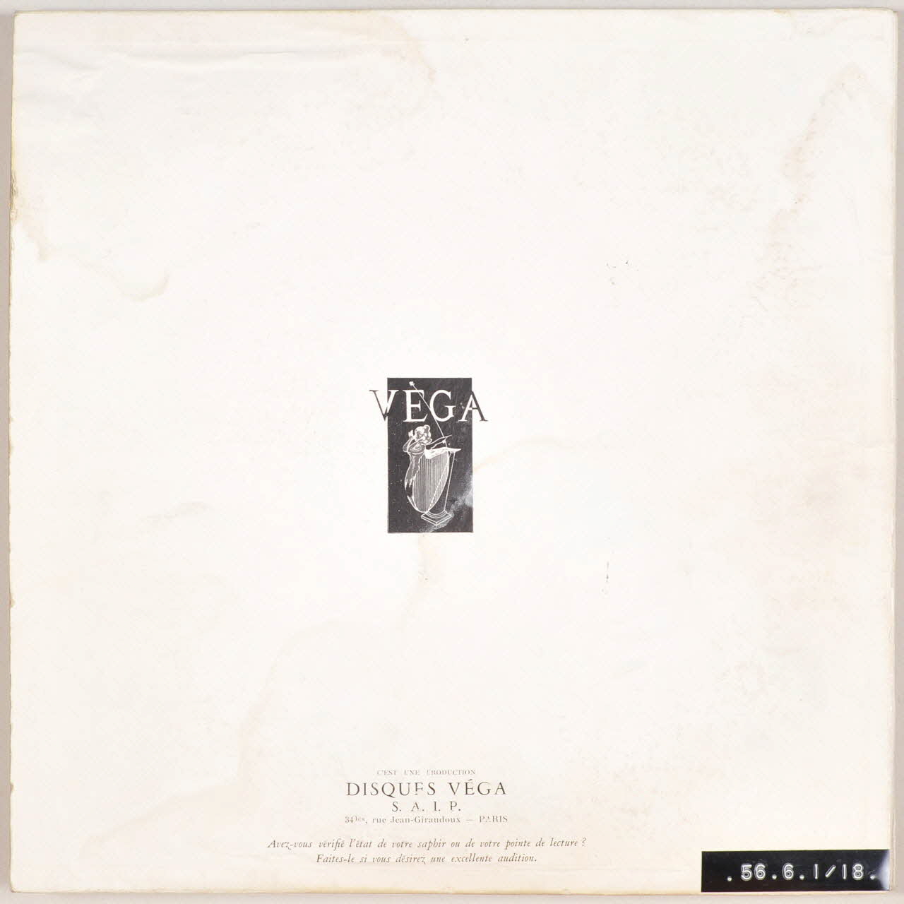 Au dos, écusson de l'éditeur avec une lyre. Au centre du disque, sur les deux faces, une étiquette circulaire en papier imprimé de couleur bleue avec une écriture jaune renseignant les titres, auteurs, exécutants et éditeur.Matériaux et techniques