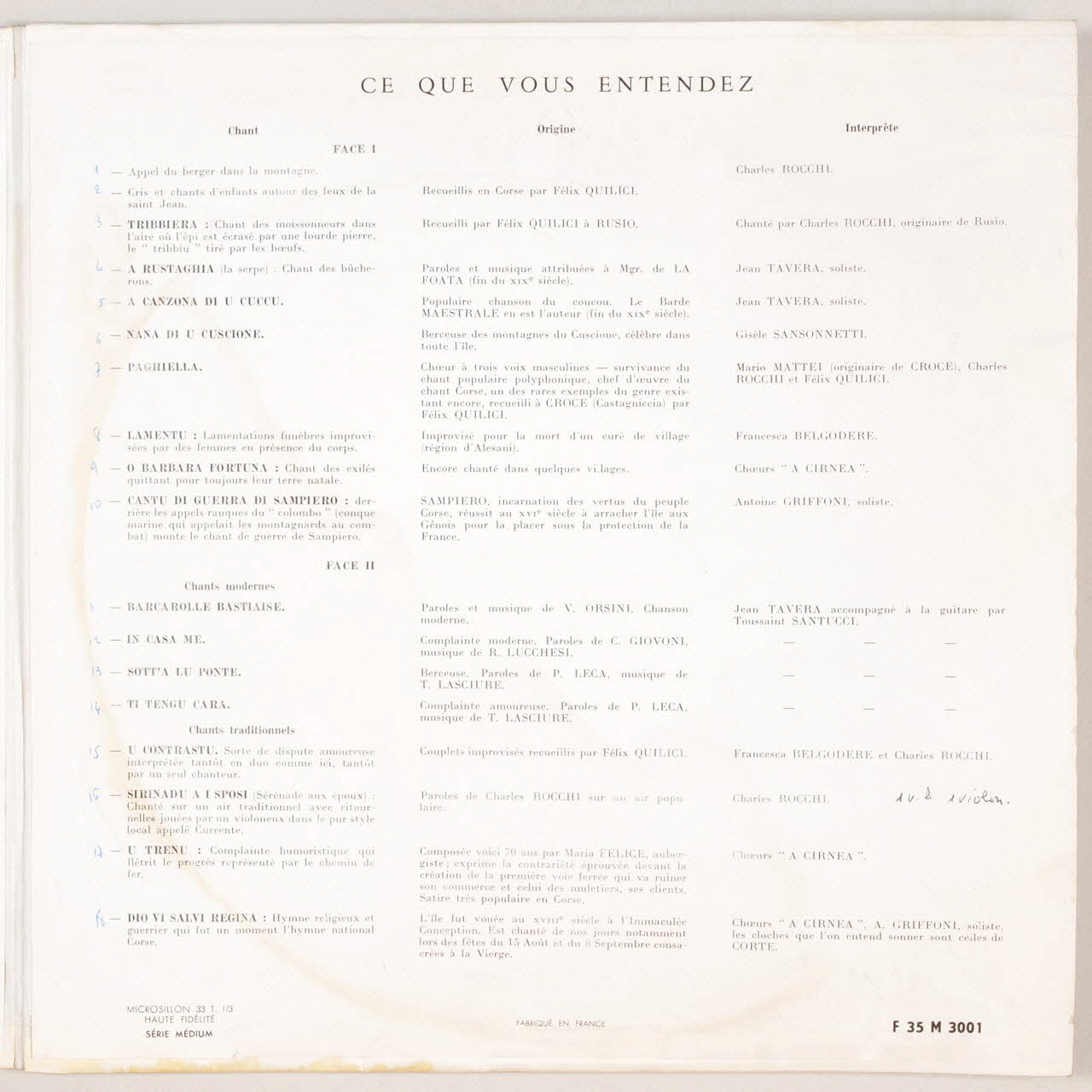 disque 33 tours, Barcarolle bastiaise, Paghiella, U trenu, Evocation de la Corse, Dio vi salvi Regina, Sirinadu a i sposi, Sott'a lu ponte, Nana di u cuscione, Tribbiera, O Barbara Fortuna, In casa me, Ti tengu cara, U cuntrastu, Lamentu, A Rustaghia, Cantu di guerra di sampiero, A canzona di u cuccu