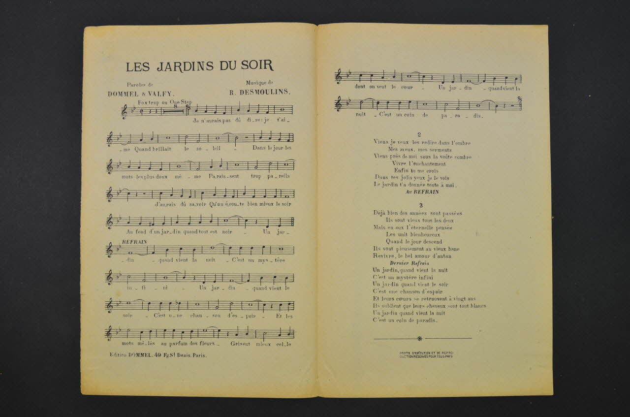 Les inscriptions renseignent le titre de la chanson, le nom des auteurs, de l'artiste et de l'éditeur. A l'intérieur, partitions et paroles de la chanson. Au dos, liste d?autres partitions publiées par l?éditeur.Décor
