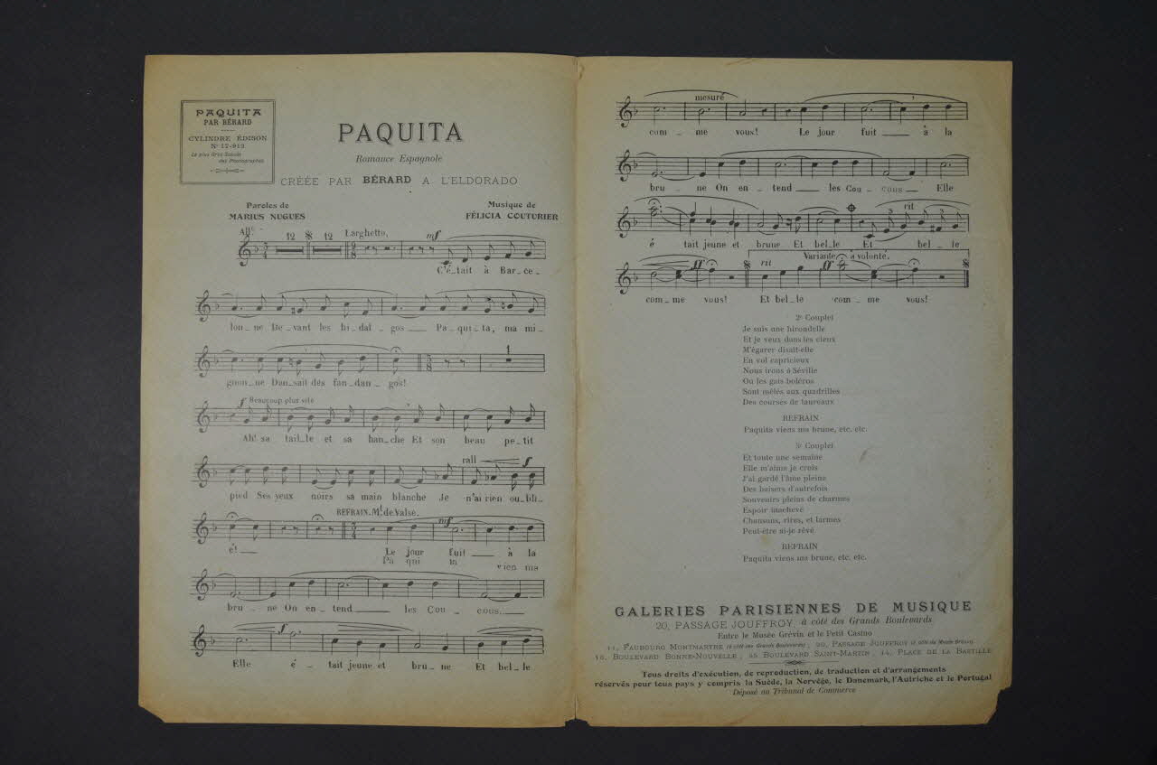 Des inscriptions renseignent le titre, les auteurs, les exécutants et l'éditeur. A l'intérieur, partition et paroles de la chanson. Au dos, liste d'autres partitions publiées par l'éditeur.Matériaux et techniques