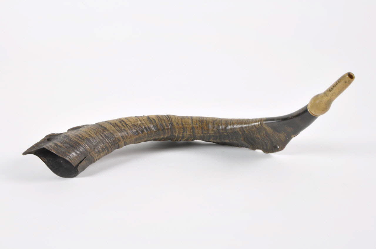 Corne d'appel en corne de bouc, à embouchure à languette, en corne plus claire, tourné et polie. Deux perforations pour accrocher un lien.Matériaux et techniques