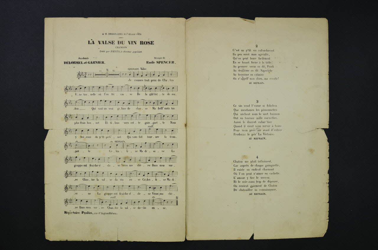 Des inscriptions renseignent le titre, les auteurs, les exécutants et l'éditeur. A l'intérieur, partition et paroles de la chanson. Au dos, liste d'autres partitions publiées par l'éditeur.Décor