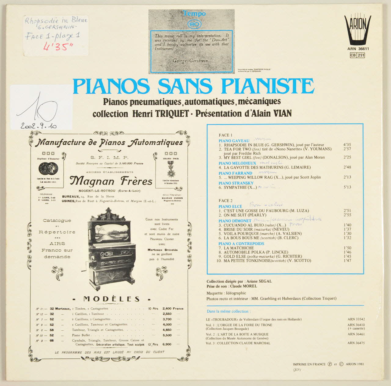 disque 33 tours, Cucuando al buio, ...weeping willow rag, L'art de la musique mécanique, vol. 4, Gold else, Ma petite tonkinoise, Voila pourquoi., Automobile polka, La gavotte des mathurins, Rhapsody in blue, C'est une gosse du faubourg, Brise du soir, La matchiche, La bous bous me, Sympathie, Tea for two, On me suit, My best girl