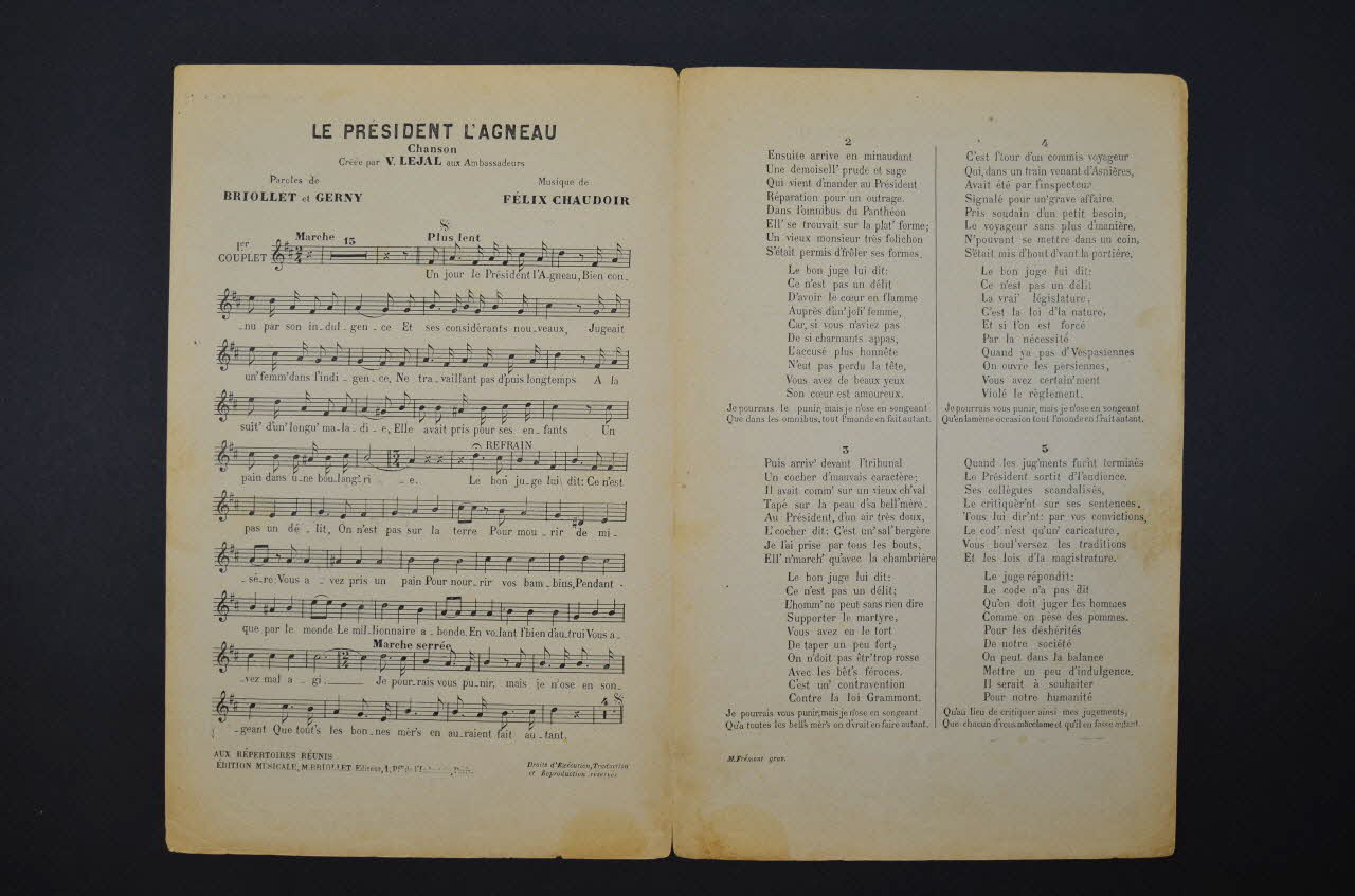 Sur la couverture, la représentation en buste de Victor Lejal. Les inscriptions renseignent le titre de la chanson, le nom des auteurs, de l'artiste et de l'éditeur. A l'intérieur, partition et paroles de la chanson. Au dos, liste d'autres partitions publiées par l'éditeur.Décor