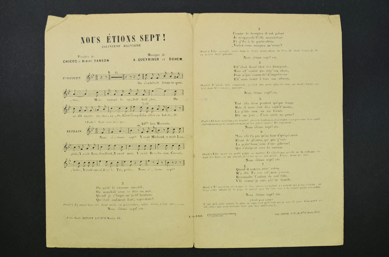 Sur la couverture, une caricature : jeune femme en costume d'employée de maison venant présenté un enfant à un militaire à la sortie de la caserne ; à l'arrière-plan, ses six camarades observant la scène en riant. Les inscriptions renseignent le titre de la chanson, le nom des auteurs, de l'artiste et de l'éditeur. A l'intérieur, partition et paroles de la chanson. Au dos, liste d'autres partitions publiées par l'éditeur.Décor