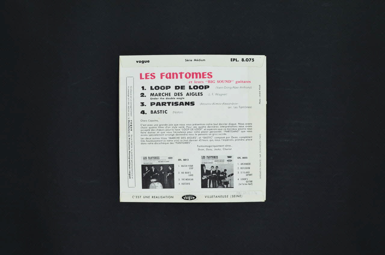 Le verso comporte le nom du groupe en rose, les titres des chansons, ainsi que le logo de l'éditeur sur fond blanc. Deux autres albums du groupes sont mentionnés dans la partie inférieure. Un onglet blanc contenant des inscriptions noires se trouve le long de la bordure gauche.