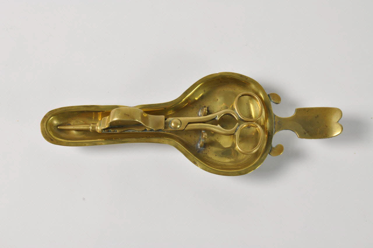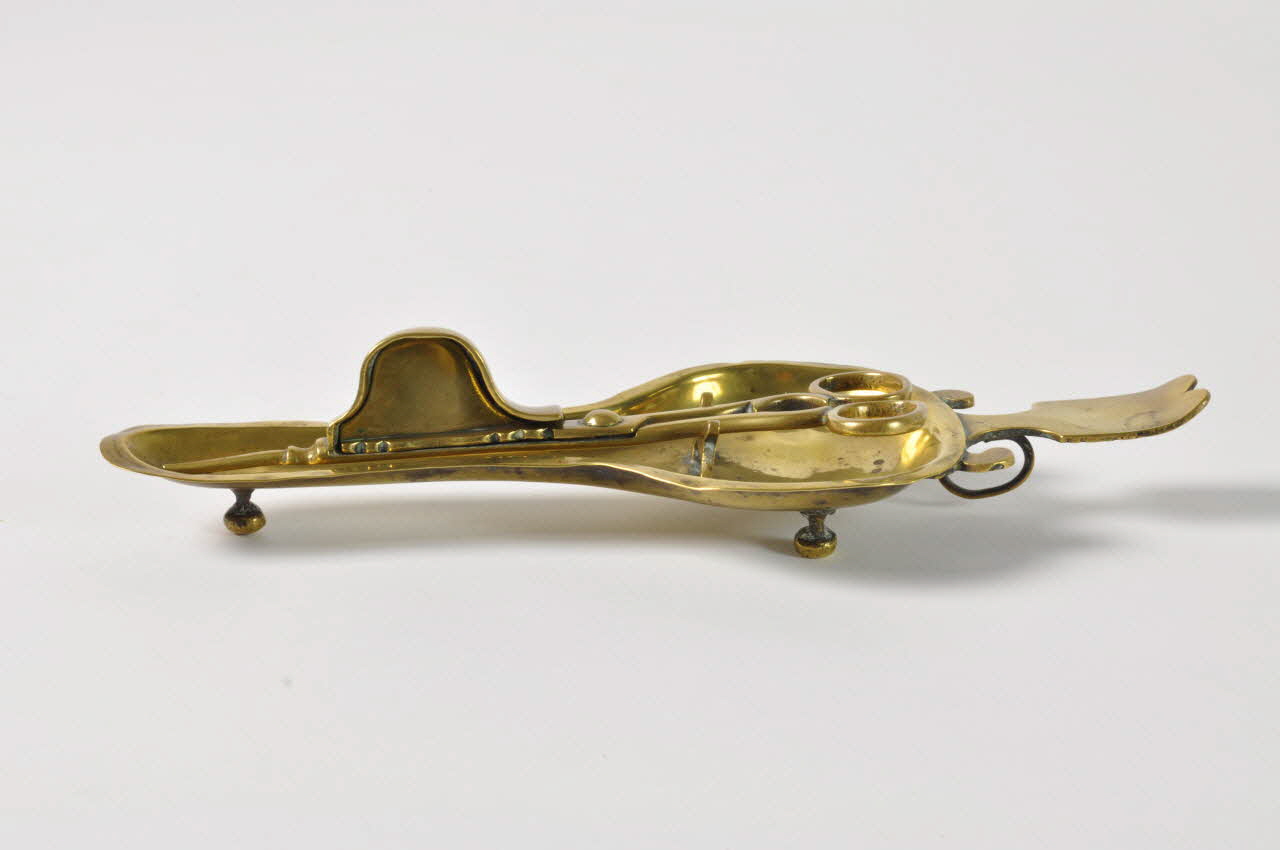 Mouchettes à branches galbées et récipient galbé. Plateau piriforme tripode avec petit support soudé et poussoir plat surmontant un fin anneau de préhension verticale soudé.Décor