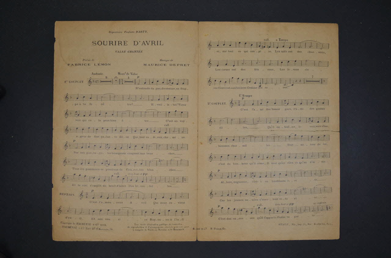 Des inscriptions renseignent le titre, les auteurs, les exécutants et l'éditeur. A l'intérieur, partition et paroles de la chanson. Au dos, liste d'autres partitions publiées par l'éditeur.Décor