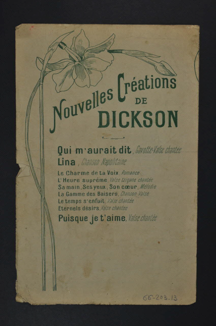 Des inscriptions renseignent le titre, les auteurs, les exécutants et l'éditeur. A l'intérieur, partition et paroles de la chanson. Au dos, liste d'autres partitions publiées par l'éditeur.Décor