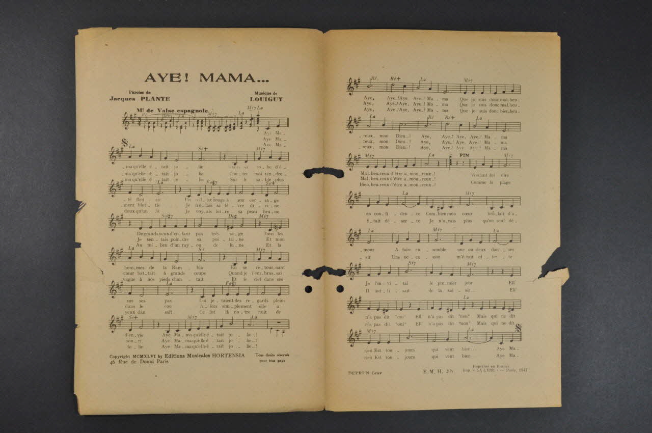 Feuillet rectangulaire en papier industriel imprimé. Le feuillet contient la partition et les paroles de la chanson. Au dos, publicité pour l'éditeur.Matériaux et techniques