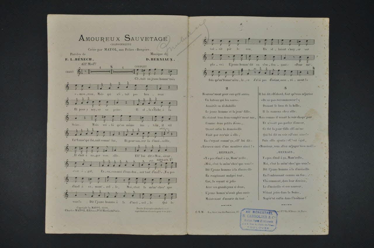 Répertoire Félix Mayol. Chanson créée par Mayol aux Folies Bergères.