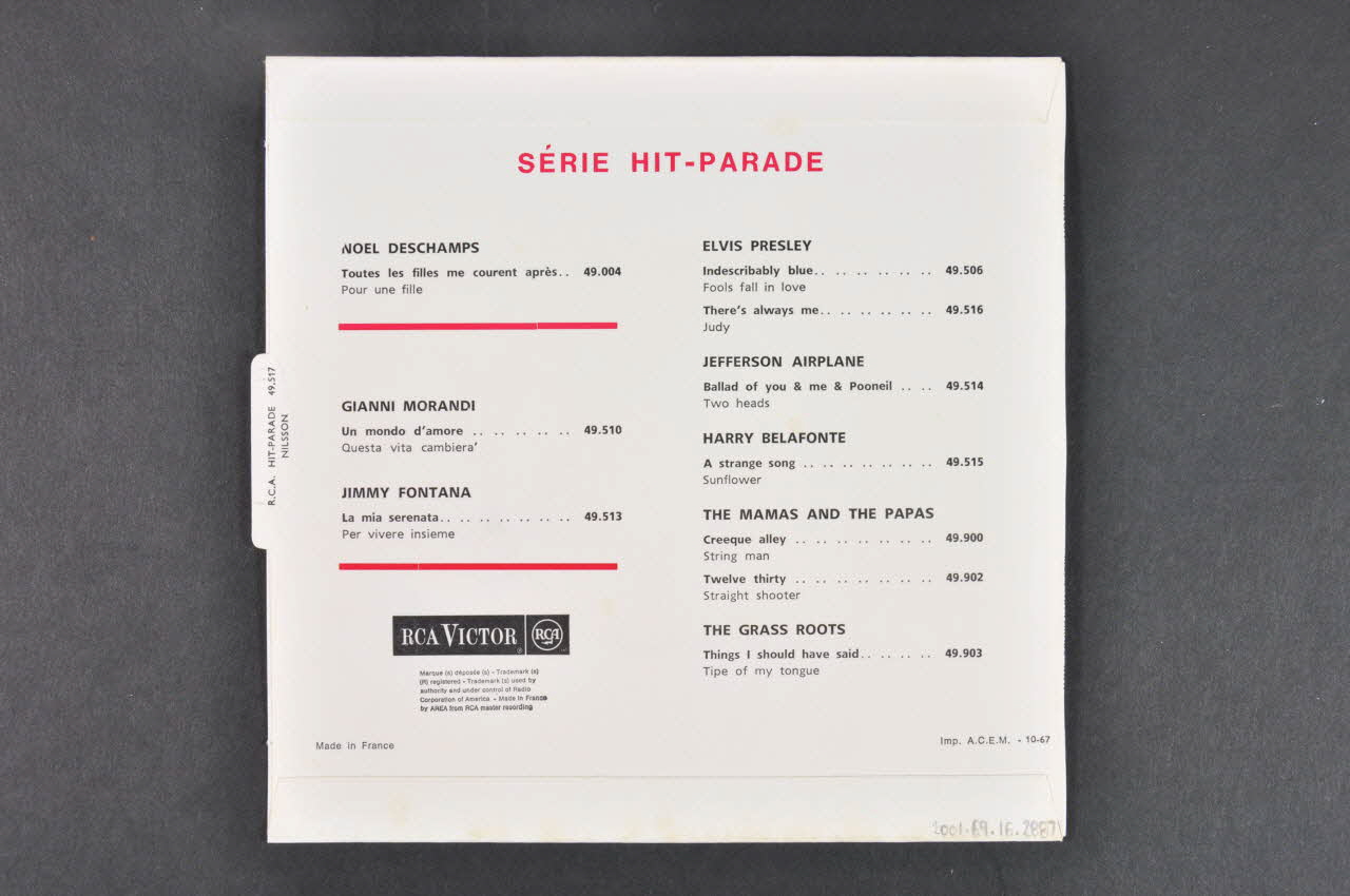 Pochette de disque de forme carrée, en papier blanc plié et collé. Des impressions de couleur noire et rouge sont présentes sur les deux faces. Au recto, figurent au sein d'un encadré rouge ; le nom du chanteur, celui de l'album et de la chanson. On peut y voir également une photographie en noir et blanc de l'artiste pensif. Le verso fait la liste de la série hit-parade. Une languette est présente sur le côté au centre, avec le nom de l'artiste inscrit en noir.Matériaux et techniques