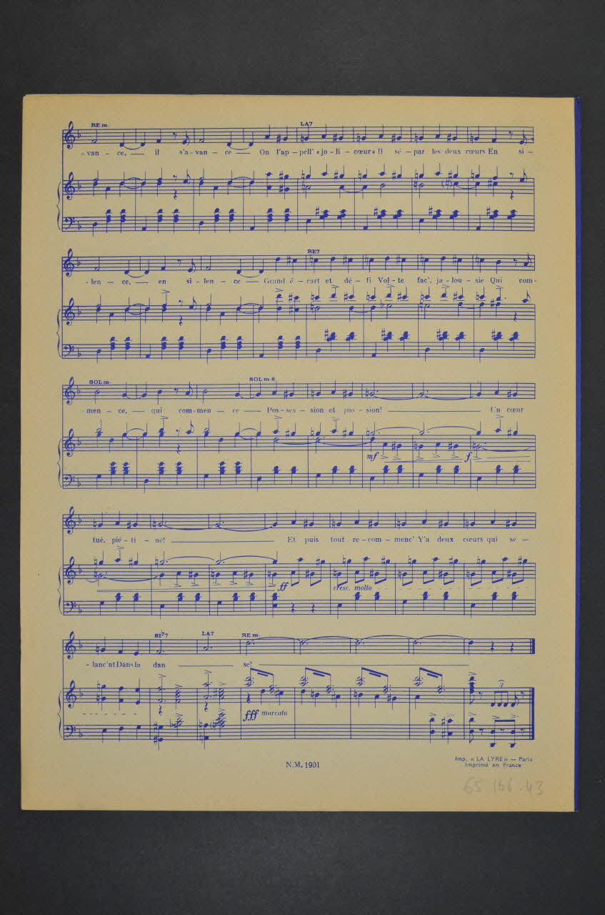 Les inscriptions précisent l'auteur de la chanson, les interprètes et l'éditeur du feuillet. L'intérieur et le dos comportent la partition et les paroles.Décor