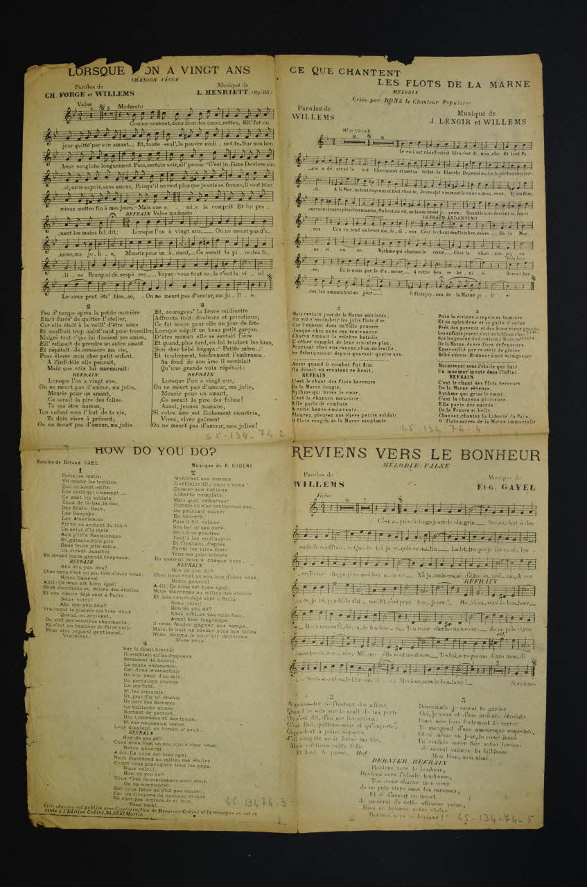 De : Date : 1916Lorsque l'on a vingt ans / Le retour // Lorsque l'on a vingt ans // Ce que chantent les flots de la marne // Reviens vers le bonheur / Lorsque l'on a vingt ans / Ce que chantent les flots de la marne / How do you do? / How do you do? / Reviens vers le bonheur / Ce que chante les flots de la marne
