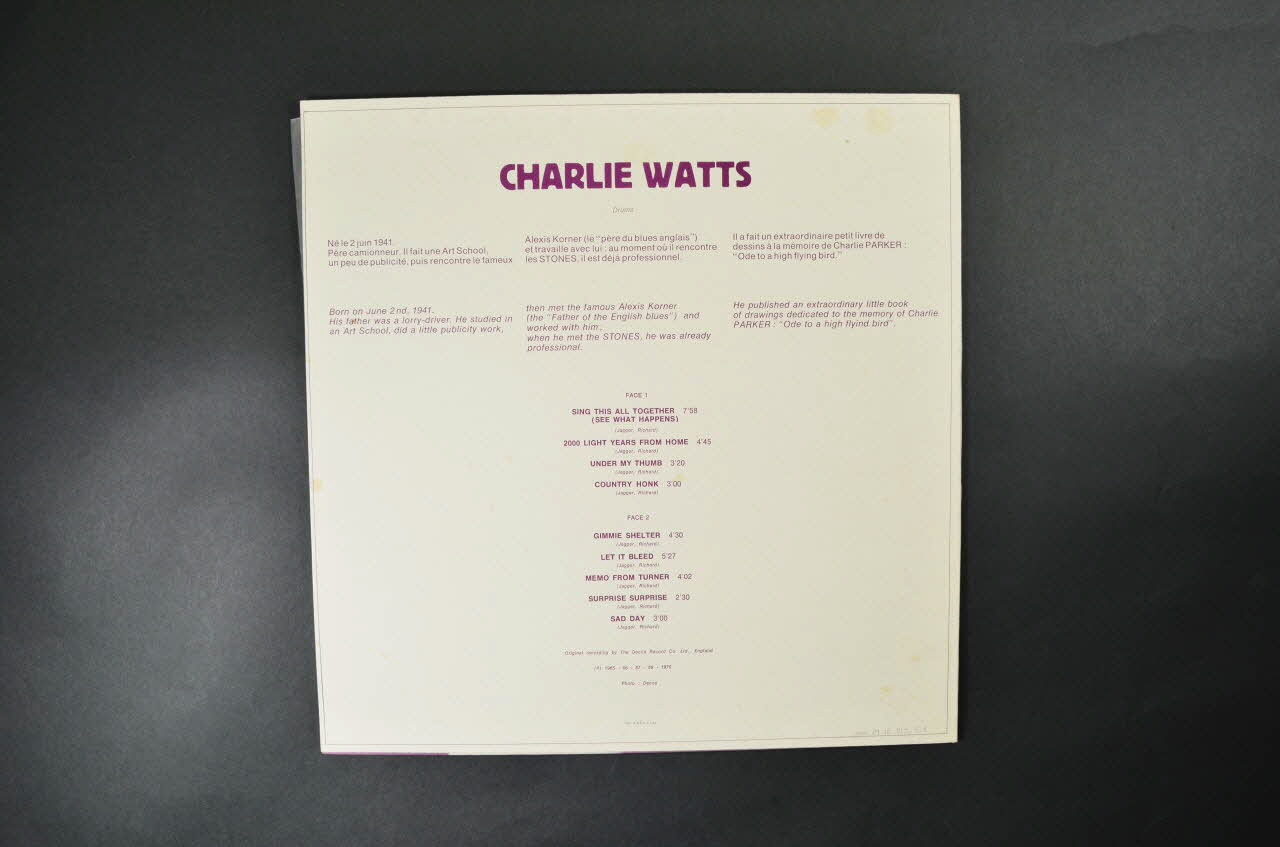 .2 : La pochette est de forme carrée, en carton, imprimée en couleur, pliée et collée. Les inscriptions sont en anglais et en français. L'ensemble est en blanc et violet. Le recto représente le portrait photographique, en violet et blanc, de Charlie Watts. Au verso, figure une petit texte sur l'artiste, en anglais et en français. Puis, sont inscrits les titres de l'album.Inscriptions