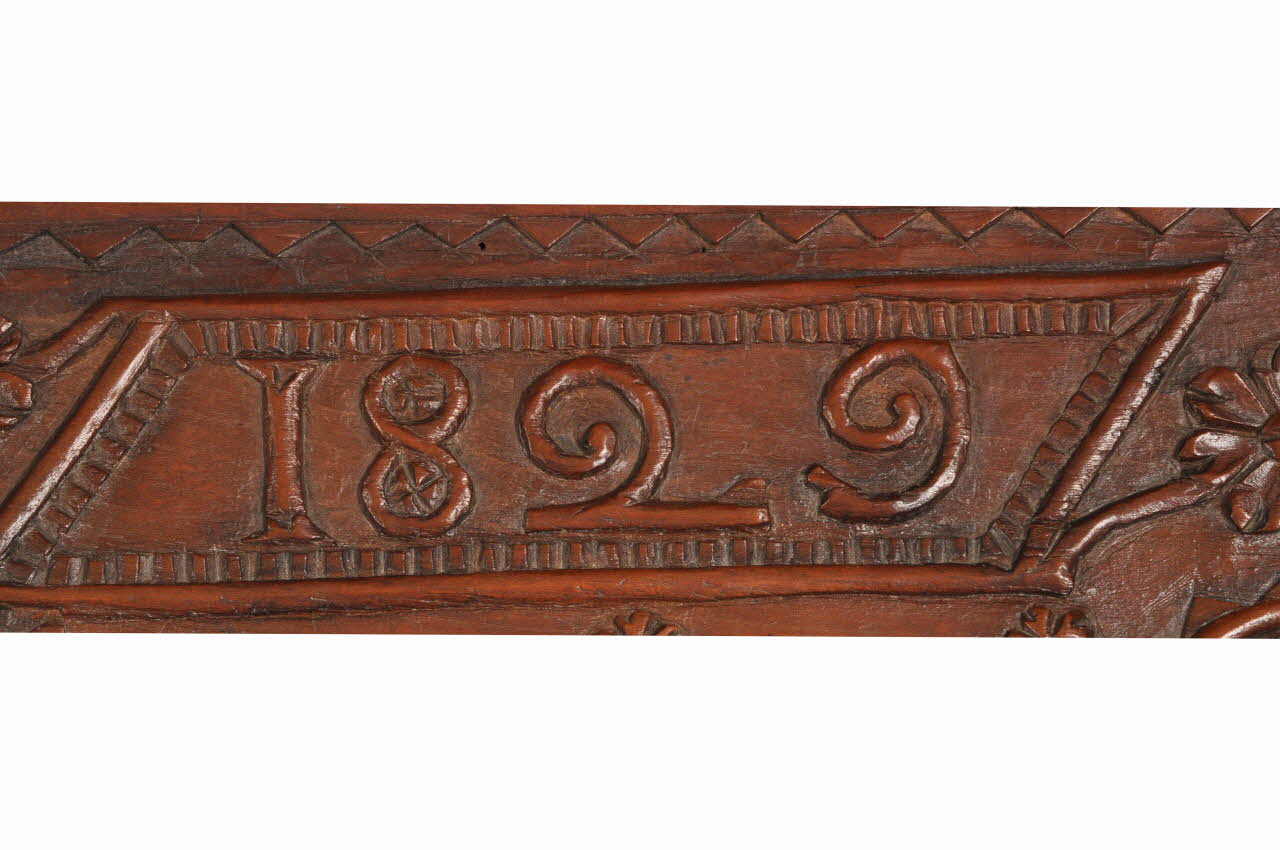 Au centre, se trouve la date 1829 enfermée dans un cartouche en forme de parallélipède et de part et d'autre de la fise une rosace aux contours moulurés encadrés par un carré.