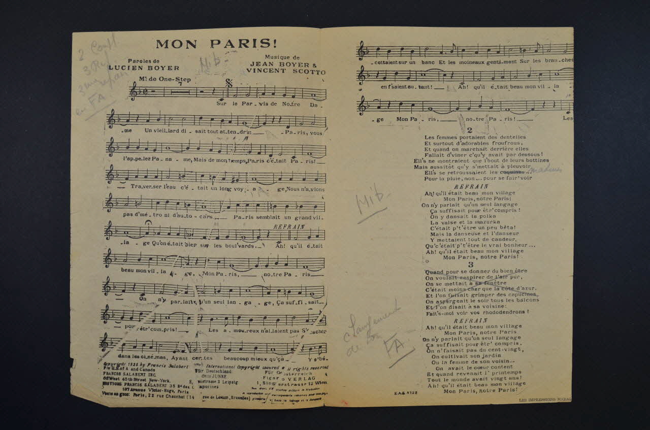 Des inscriptions renseignent le titre, les auteurs, les exécutants et l'éditeur. A l'intérieur, partition et paroles de la chanson. Au dos, liste d'autres partitions publiées par l'éditeur.Décor