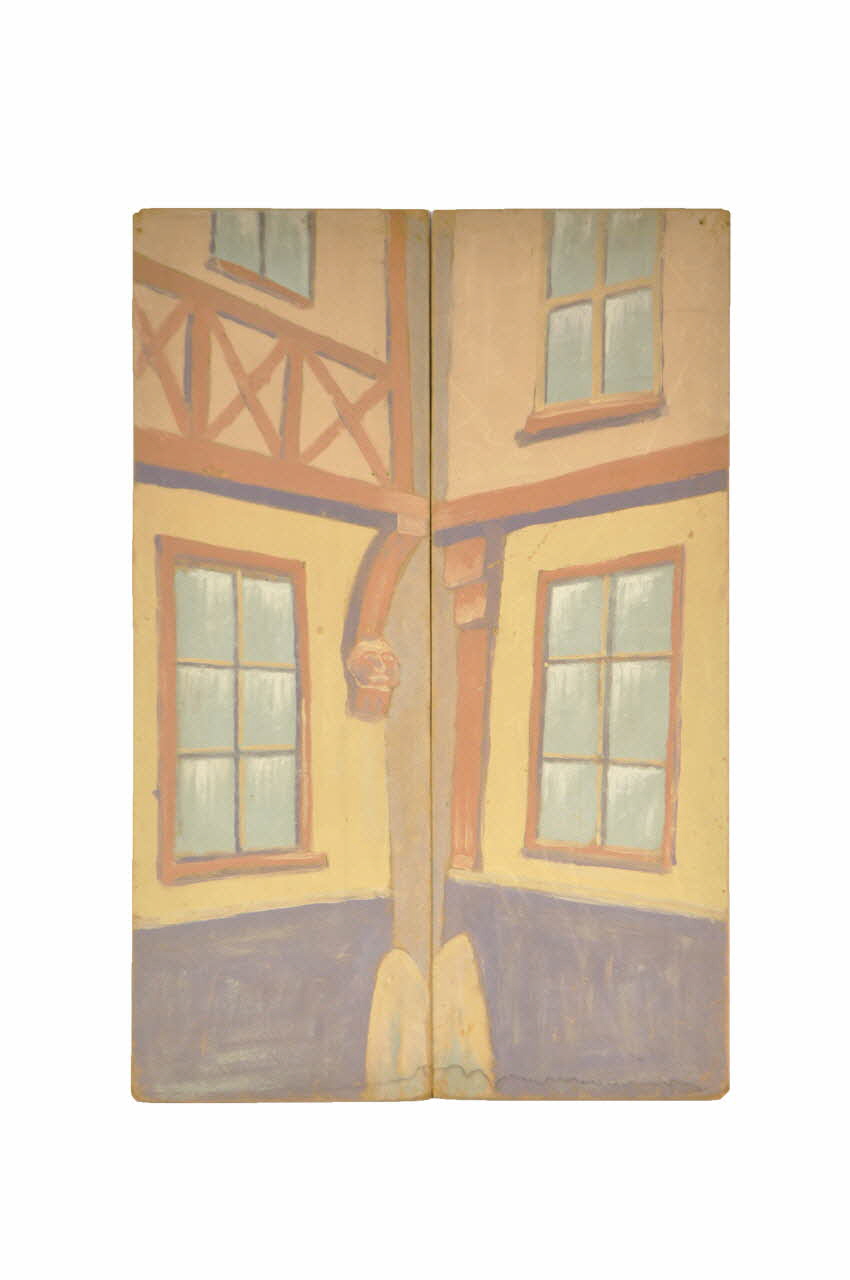 Le décor présent se développe sur les deux faces. L'une des faces se compose de façades de maisons et l'autre comporte un intérieur avec des poutres apparentes.Matériaux et techniques