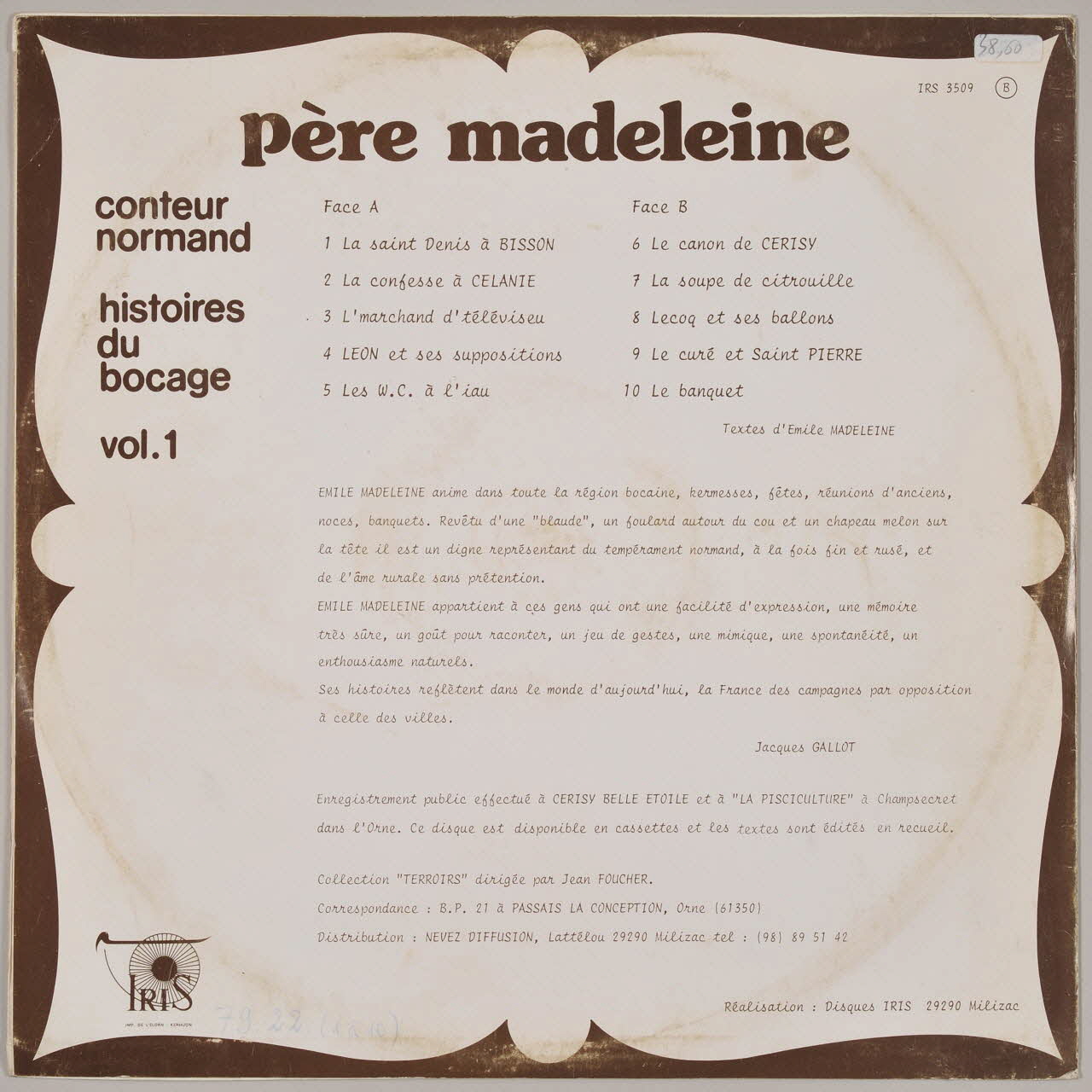 disque 33 tours, Léon et ses suppositions, Le curé et Saint Pierre, La saint Denis à Bisson, Les W.C. à l'iau, La soupe de citrouille, Histoires du bocage, Le banquet, Le canon de Cerisy, La confesse à Célanie, Lecoq et ses ballons, L'marchand d'téléviseu
