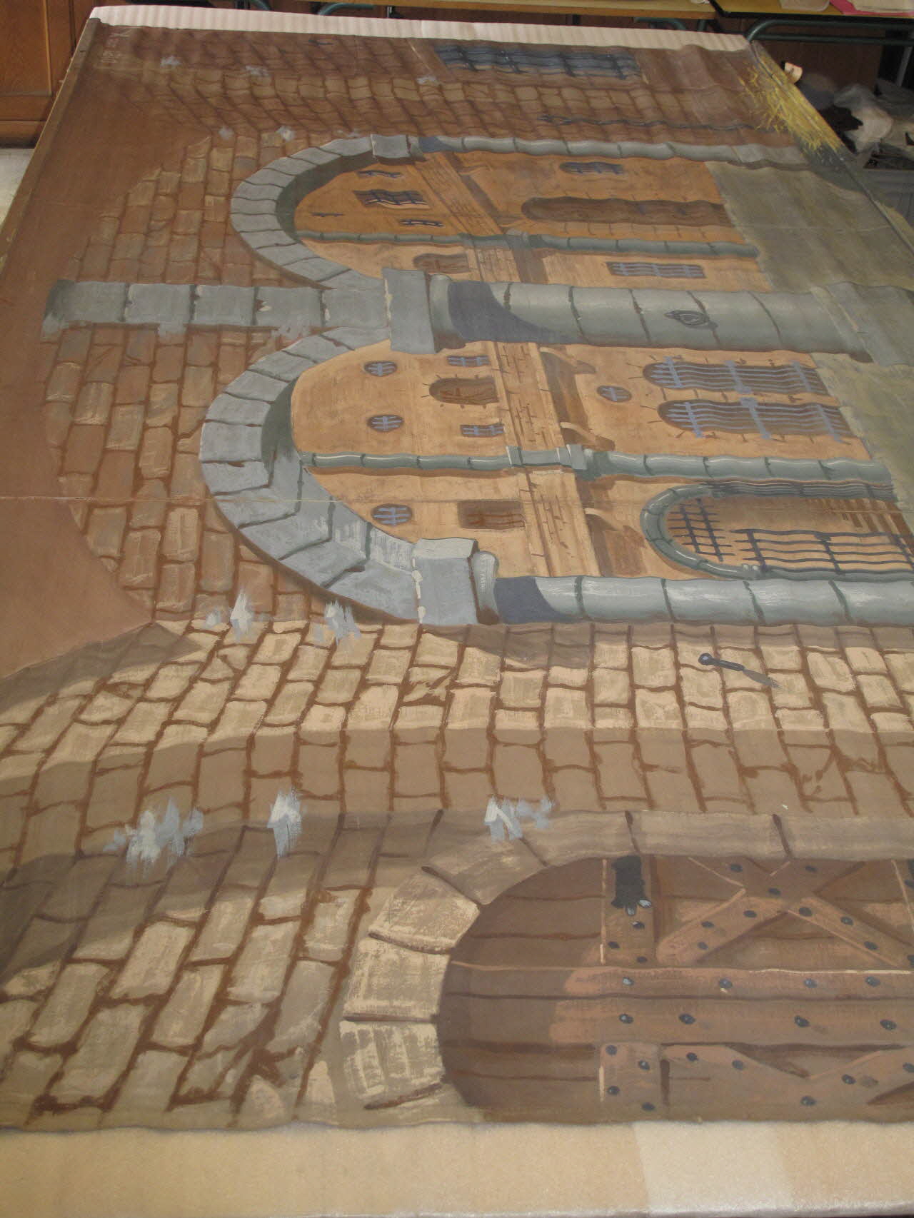 deux barres de suspension / toile peinte à la colle / La toile de fond représente au recto un cloître pour le décor de Don-Juan et au verso une prison dont on apreçoit la cour et les grilles. la toile est constituée de trois bandes de toile cousues ensemble.Décor