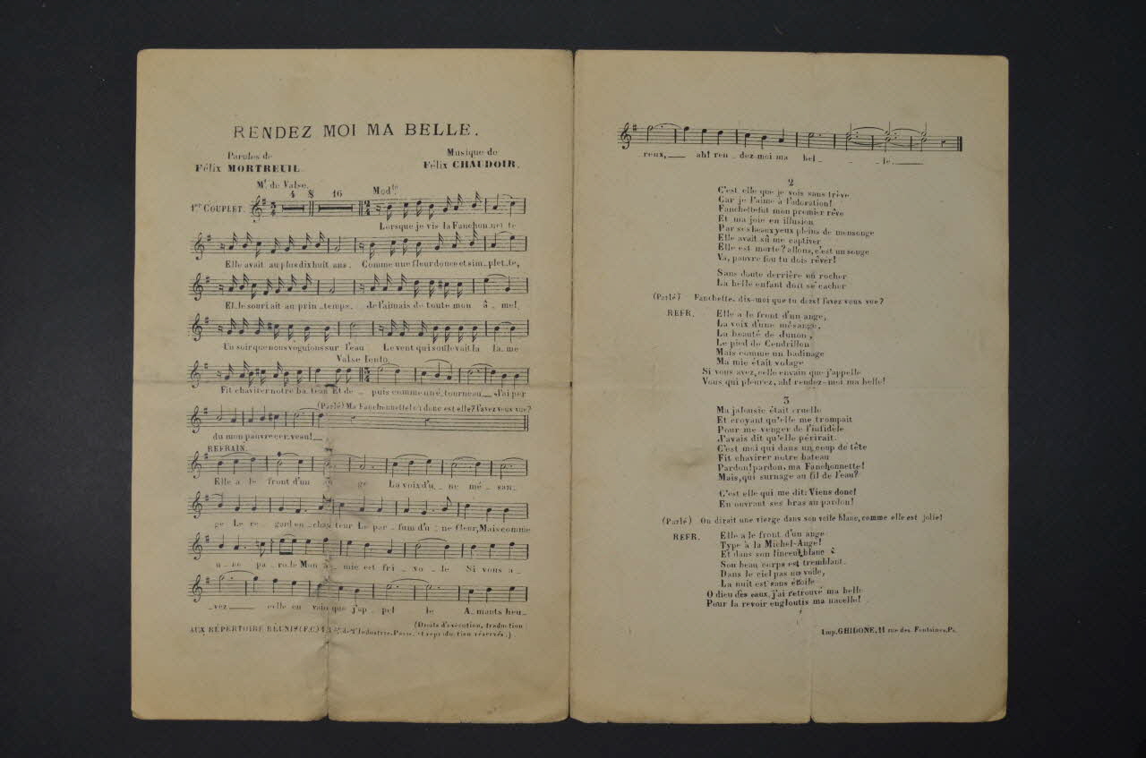 La première page présente le portrait de Bérard. Les inscriptions précisent le titre de la chanson, l'auteur et l'éditeur. A l'intérieur se trouvent la partition et les paroles de la chanson. Au dos se trouve une liste des morceaux disponibles chez le même éditeur.Matériaux et techniques