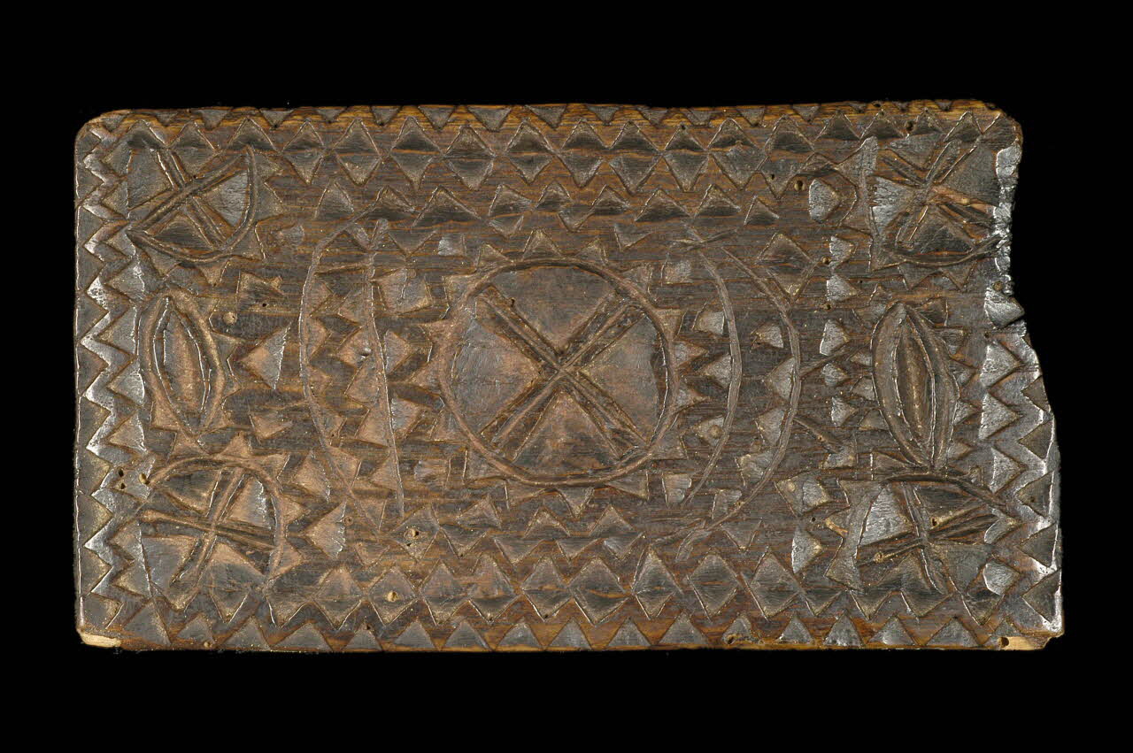 Bois taillé / Rectangulaire. Décor géométrique, d'un côté un cercle avec étoile et 5 feuilles, autre cercle avec rosace à 4 feuilles, encadrement dents de scie ; de l'autre côté au centre cercle avec croix, dents de scie, aux coins petit cercle avec croixDécor