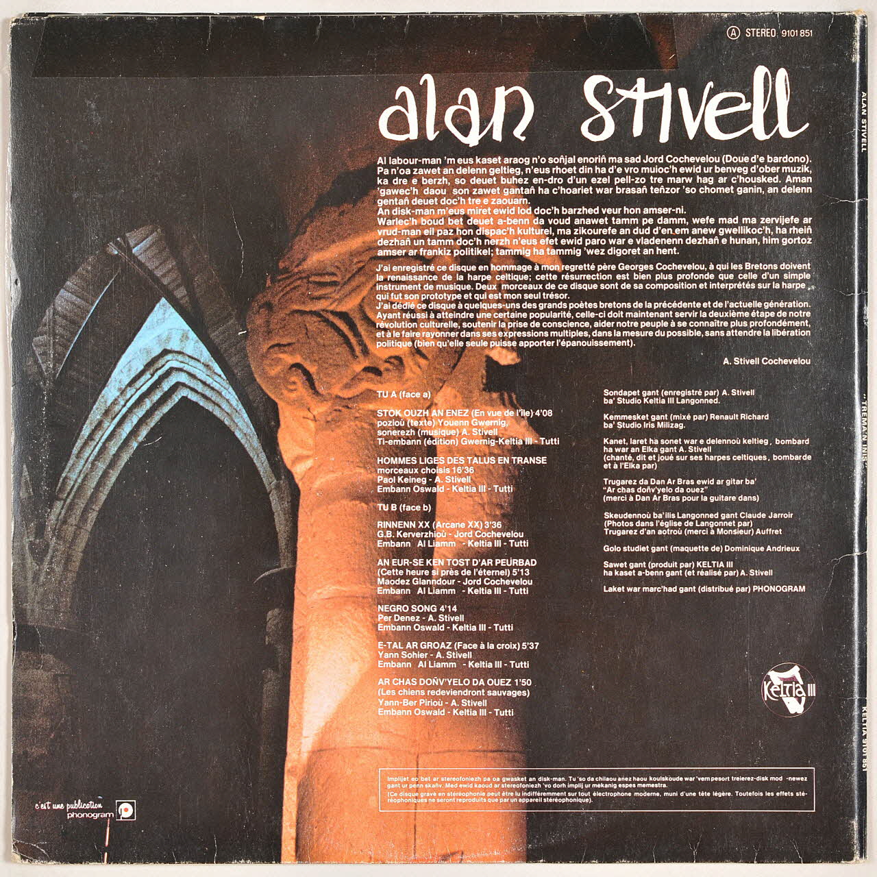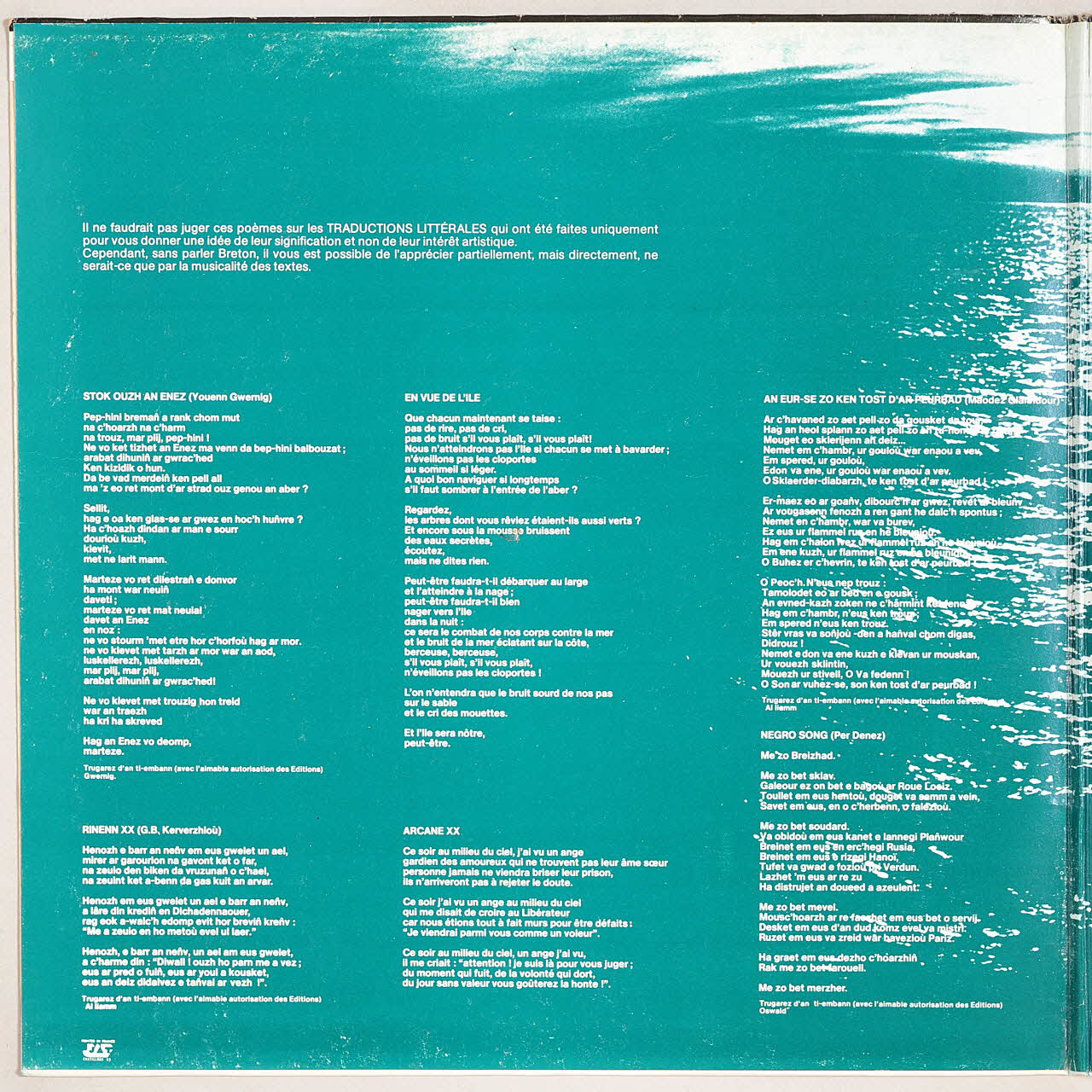 Le verso est composé d'une photographie d'un chapiteau roman surmontant une colonne. En arrière plan, on voit un arc brisé dans une lumière bleue. Sur la partie droite se trouve un texte de Stivell en breton, traduit en français, et les noms des chansons. La pochette s'ouvre et présente un fond représentant une vue de la mer au soleil couchant dans un ton vert d'eau. L'intérieur de la pochette contient les paroles des chansons, en breton et en français. L'étiquette du disque est noire et imprimée en argenté.Inscriptions