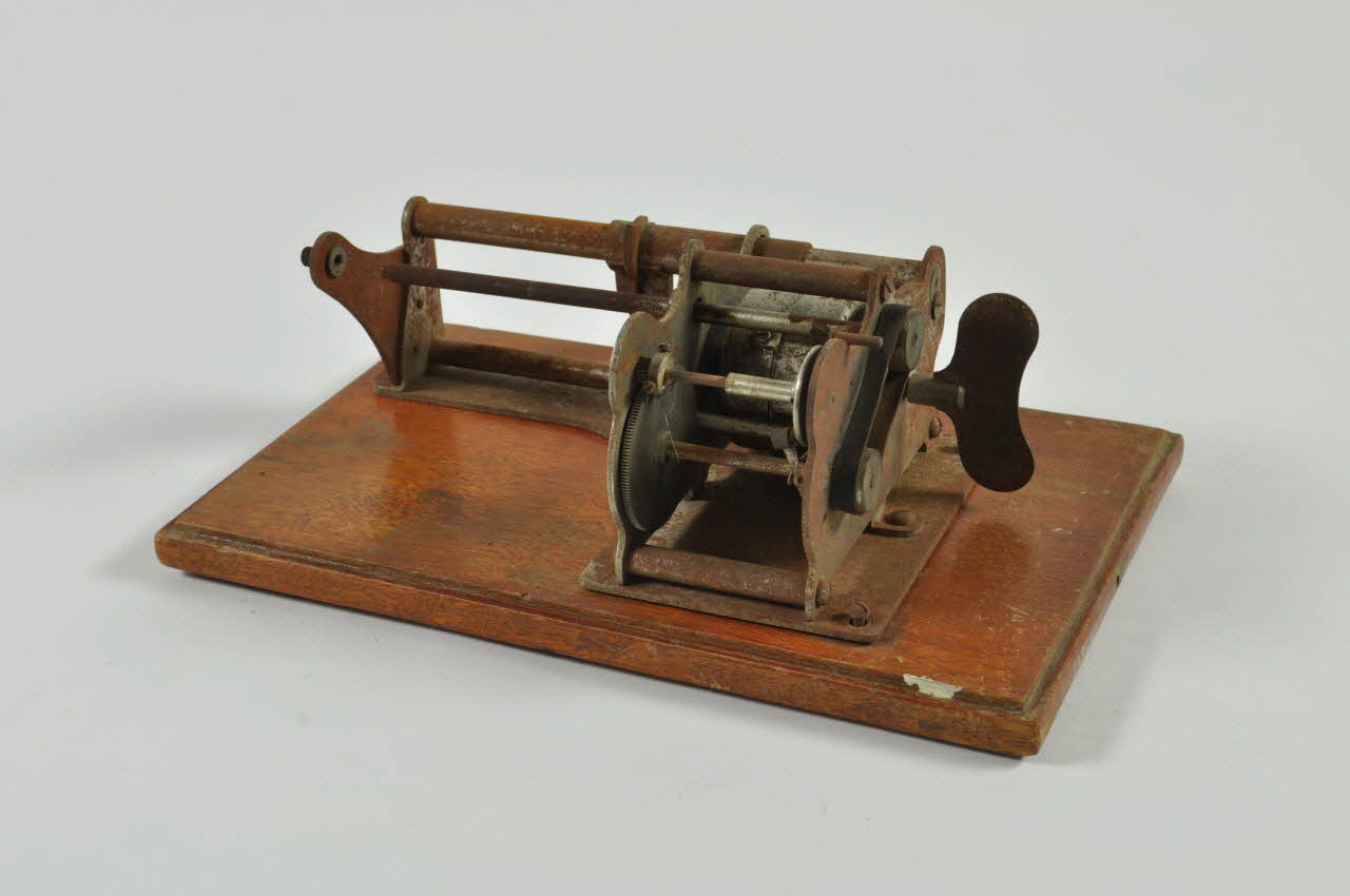 Lecteur de cylindre Edison et mécanisme en métal muni d'une clé, fixé sur une planchette de bois. Une courroi de caoutchouc noir relie deux poulie sur un bord extérieur du mécanisme. Celui-ci peut être arrêter par un crochet métallique.Matériaux et techniques