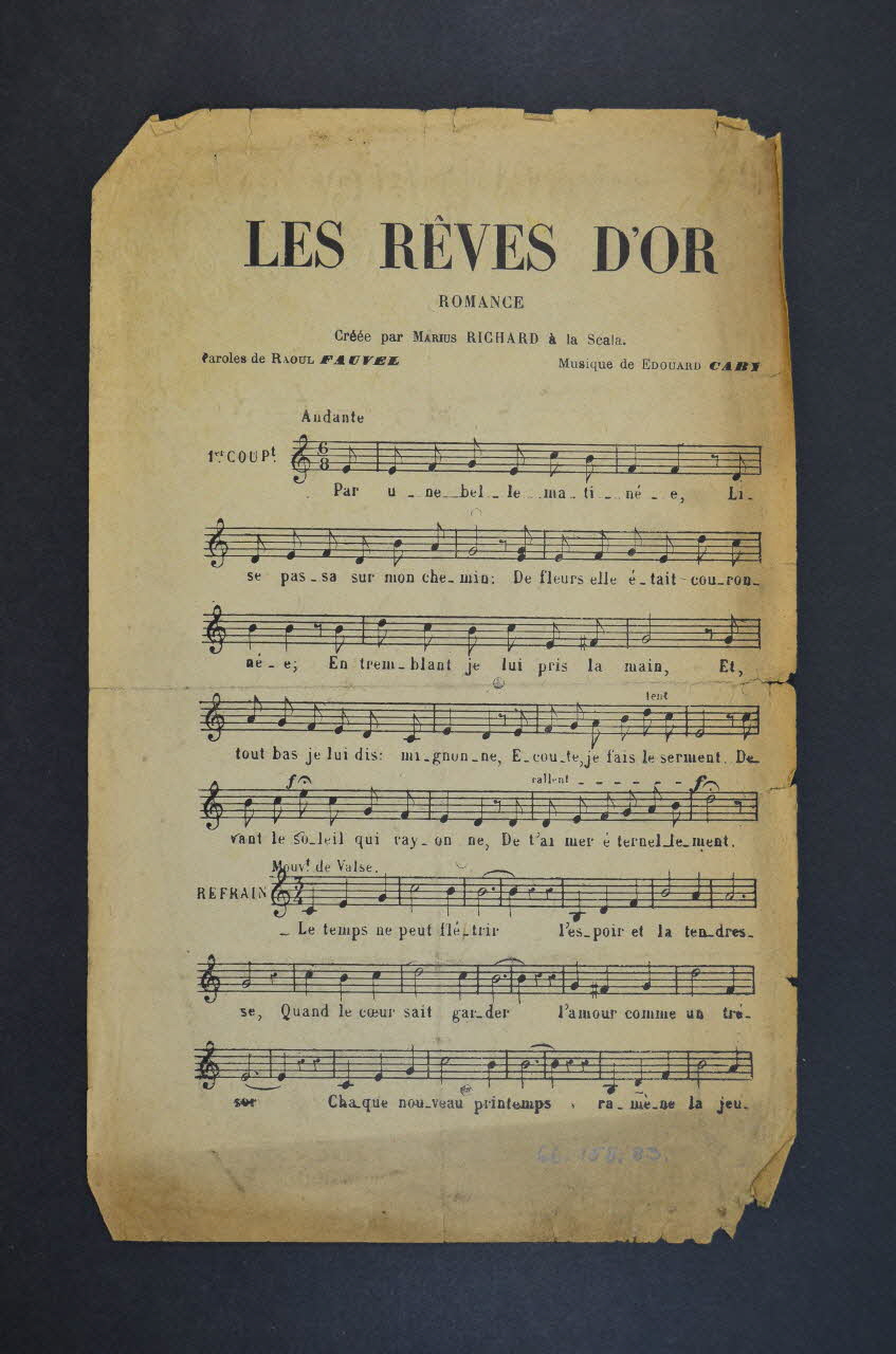 Les inscriptions précisent l'auteur de la chanson, les interprètes et l'éditeur du feuillet. Au dos, la partition.Décor
