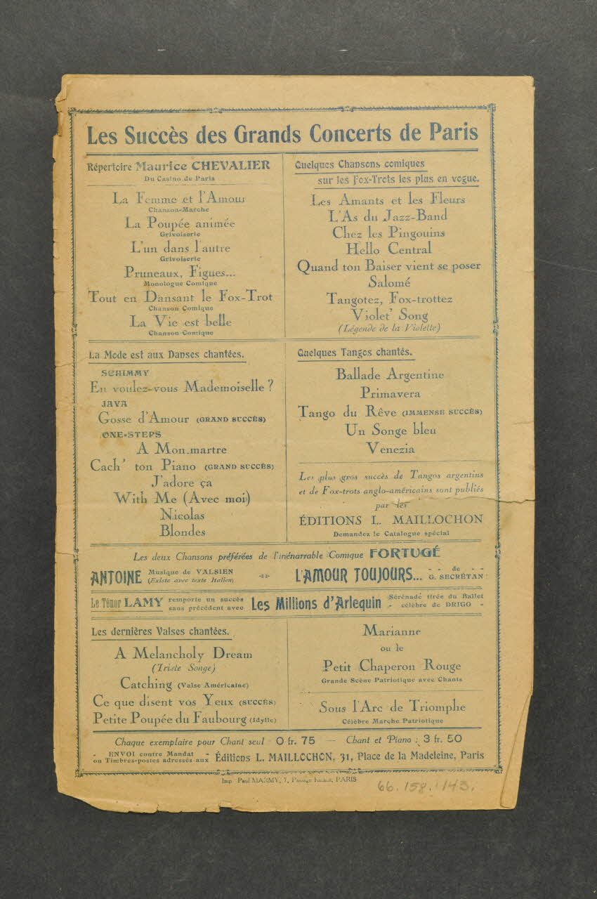 Les inscriptions renseignent le titre de la chanson, le nom des auteurs, de l'artiste et de l'éditeur. A l'intérieur, partitions et paroles de la chanson. Au dos, liste d?autres partitions publiées par l?éditeur.Décor