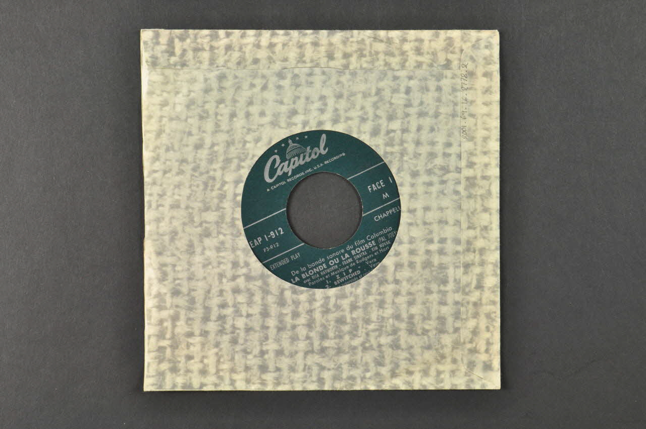 .1 : Le disque rond et noir comporte une perforation circulaire au centre. Une étiquette verte contenant le nom de l'interpréte et de l'orchestre, le titre des morceaux, le logo de l'éditeur ainsi que d'autres inscriptions argentées, est collée au centre.