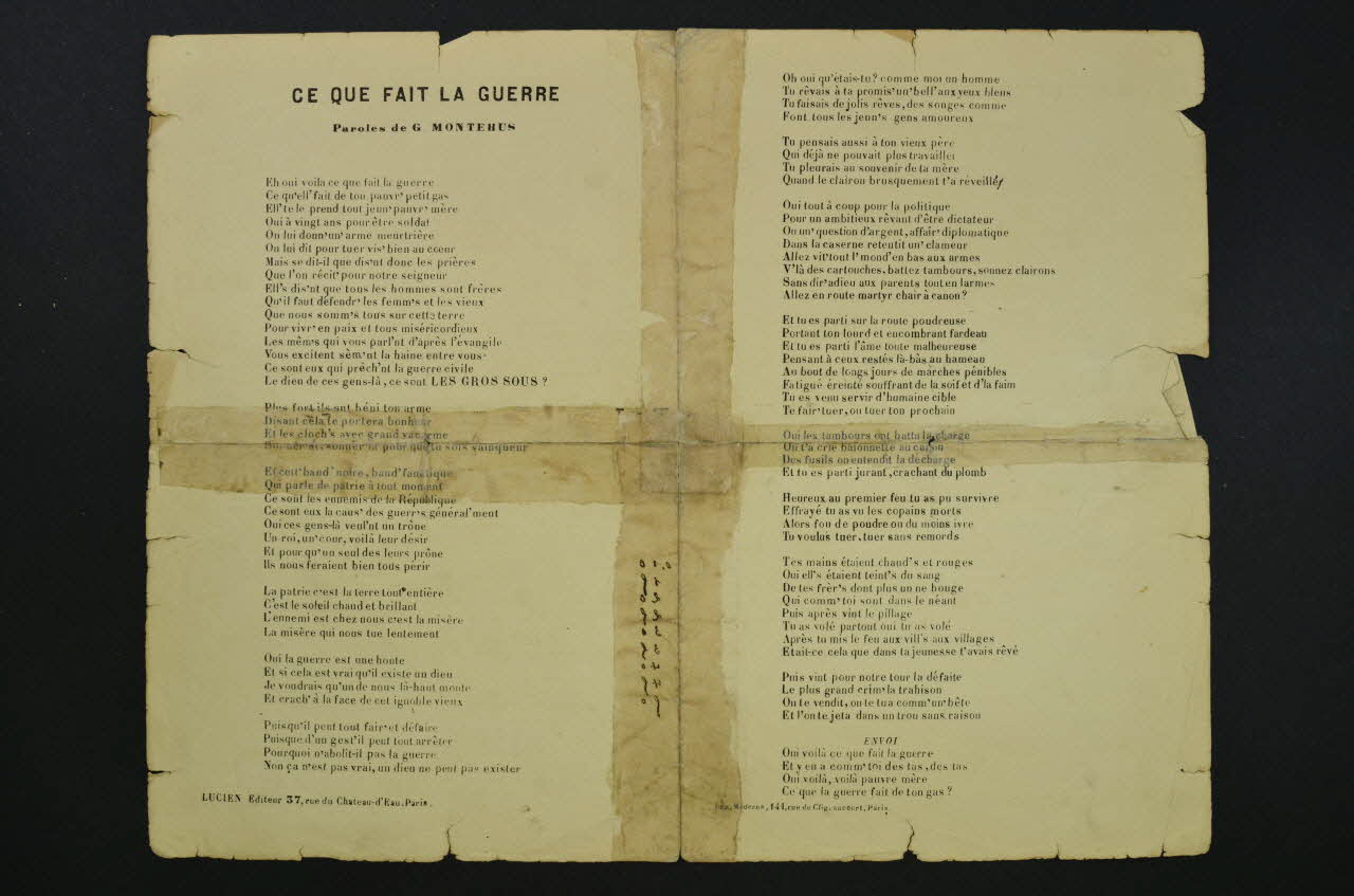 La couverture du feuillet présente le dessin d'un soldat avec capote tenant un crâne; à l'arrière-plan un champ de bataille (ou charnier) avec vol d'oiseaux) ; dans un cartouche rectangulaire, à droite, le portrait dessiné de Monthéus, de profil. Les inscriptions renseignent le titre de la chanson, le nom des auteurs, de l'artiste et de l'éditeur. A l'intérieur, partition et paroles de la chanson. Au dos, liste d'autres partitions publiées par l'éditeur.Inscriptions