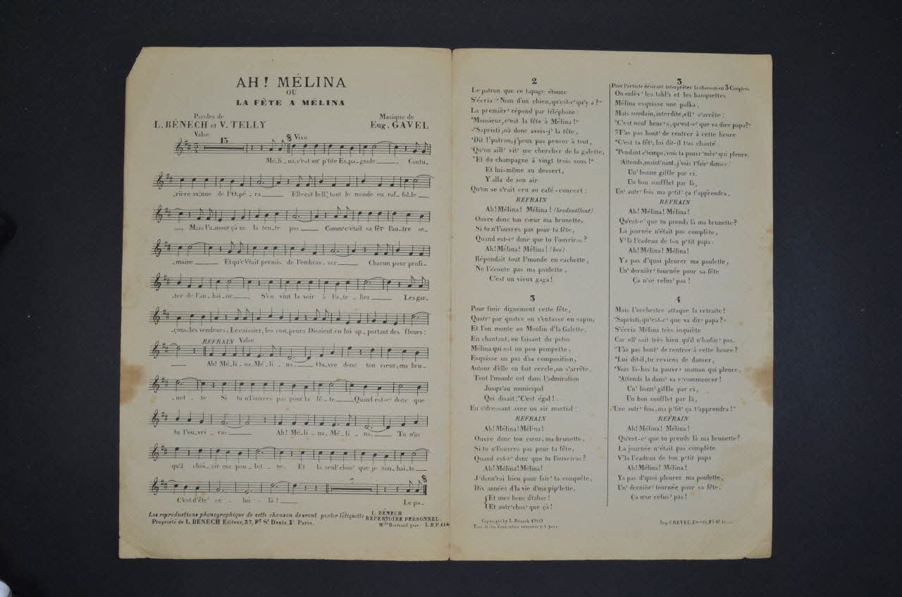 Des inscriptions renseignent le titre, les auteurs, les exécutants et l'éditeur. A l'intérieur, partition et paroles de la chanson. Au dos, liste d'autres partitions publiées par l'éditeur.Matériaux et techniques