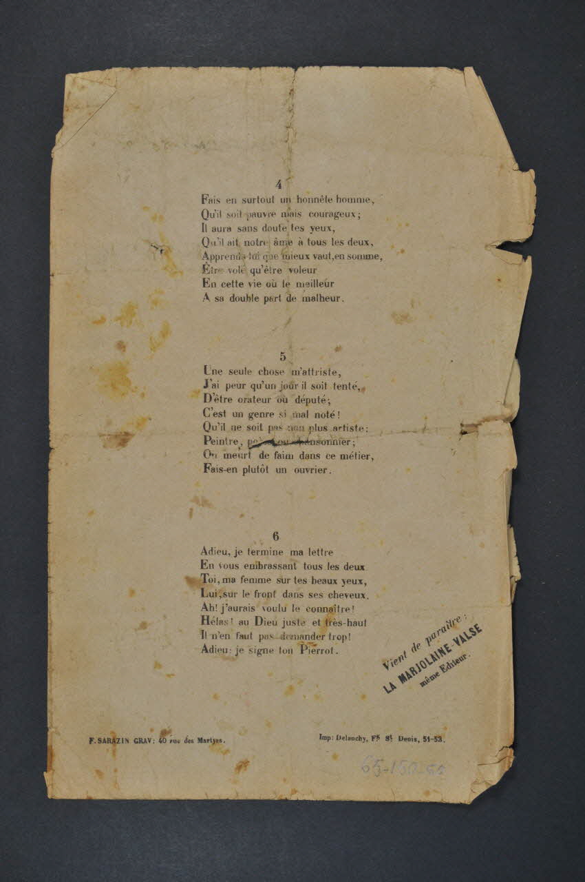 Au recto et au verso, partition et paroles de la chanson ; les inscriptions renseignent le titre de la chanson, le nom des auteurs, de l'artiste et de l'éditeur.Matériaux et techniques