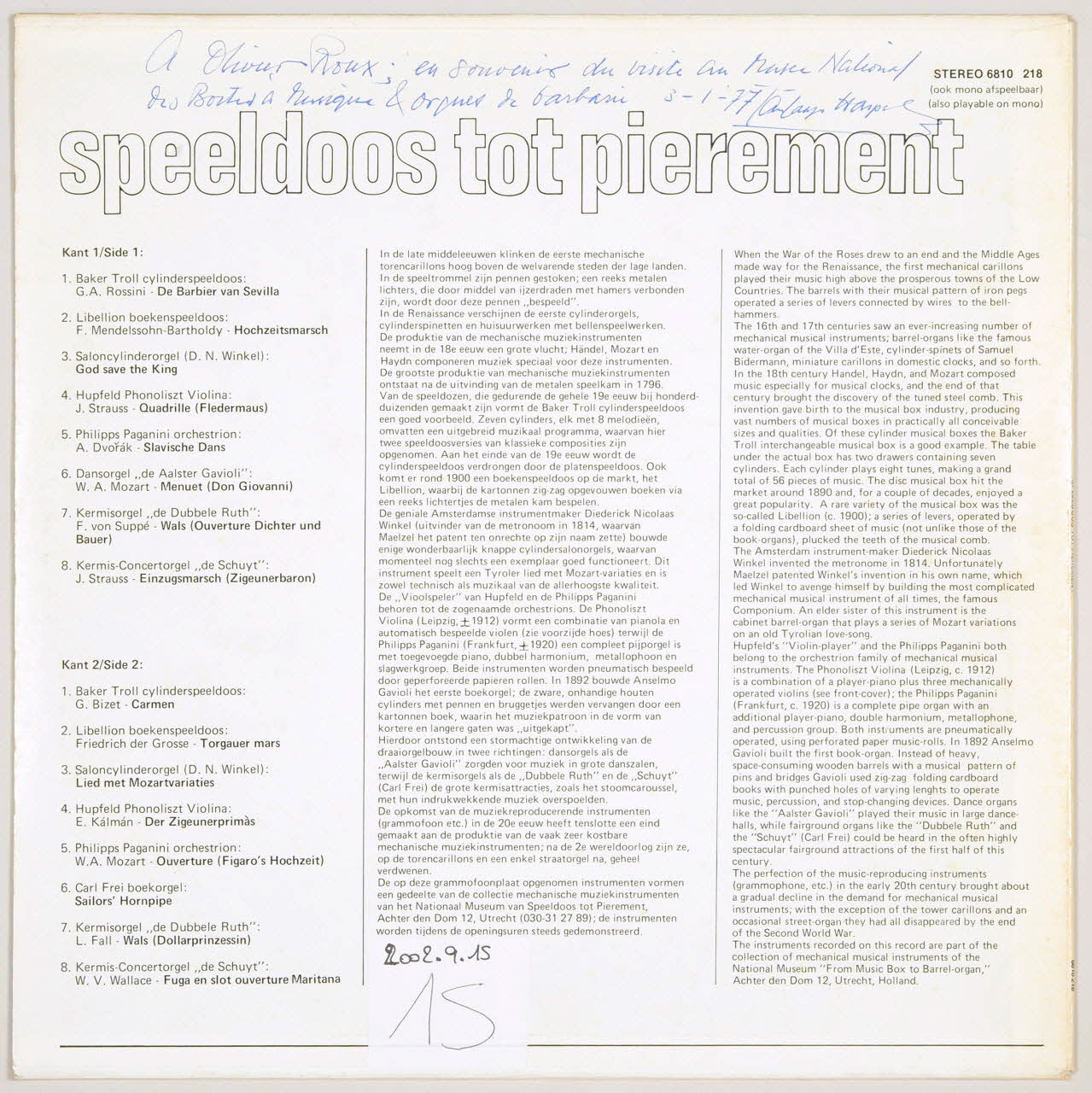 disque 33 tours, Carmen, Slavische Dans, Speeldoos tot pierement, Wals, Fuga en slot ouverture Maritana, Lied met Mozartvariaties, Sailor's Hornpipe, Quadrille, De barbier van Sevilla, Wals, Torgauer mars, Ouverture, Der Zigeunerprimas, Menuet, Hochzeitsmarsch, Einzugsmarsch, God save the King