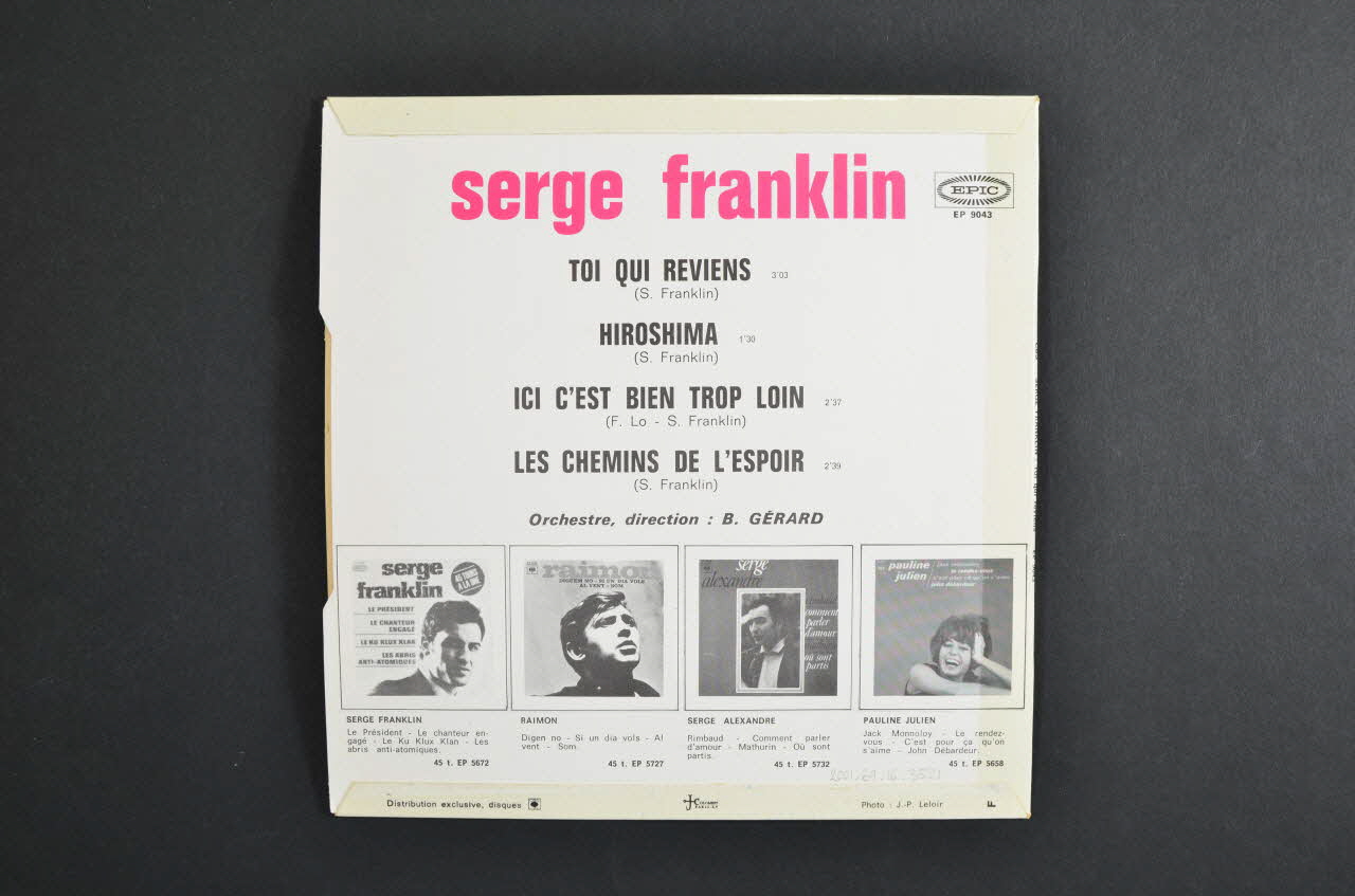 A l'arrière figurent, sur fond blanc, le nom du chanteur en fuchsia, les titres en noir, et en dessous quatre reproductions noir et blanc de pochettes de disques.Matériaux et techniques