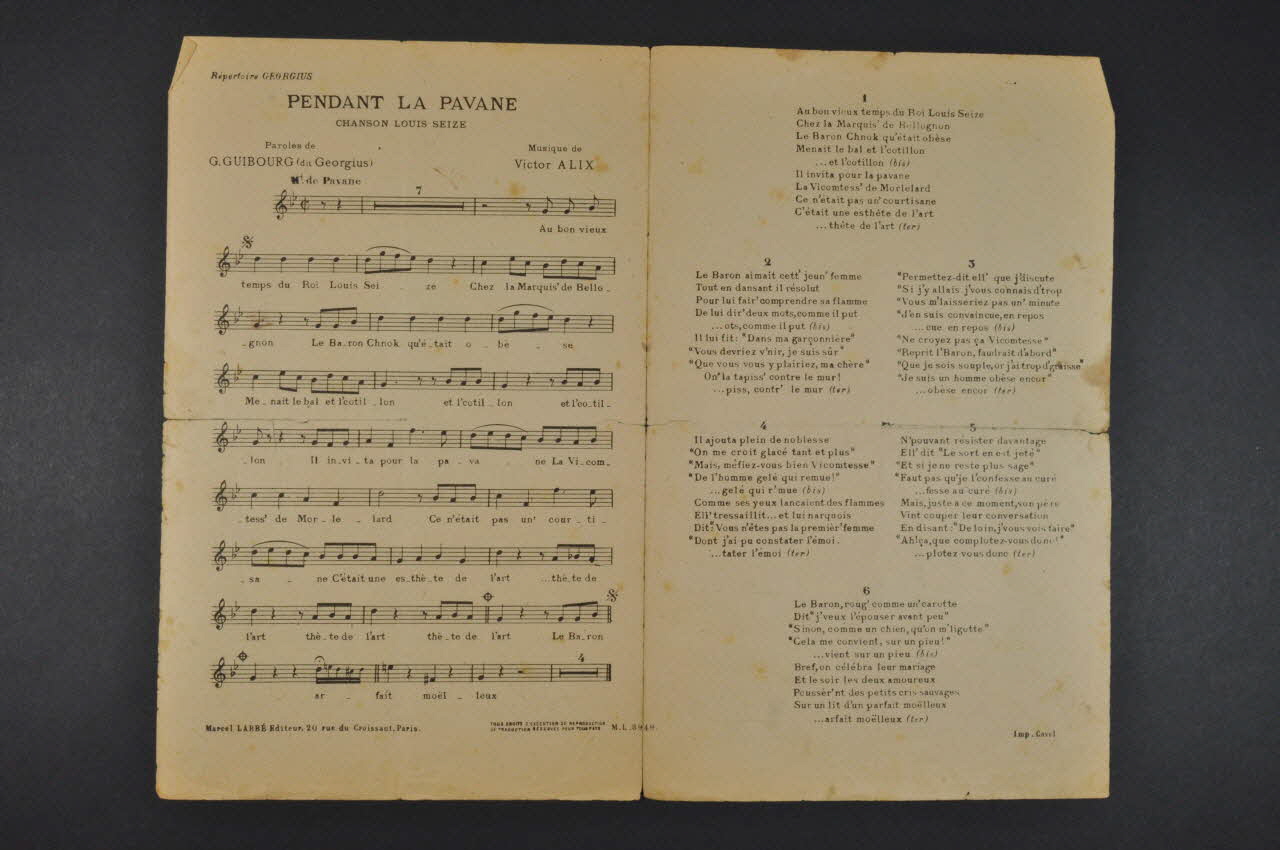 Des inscriptions renseignent le titre, les auteurs, les exécutants et l'éditeur. A l'intérieur, partition et paroles de la chanson. Au dos, liste d'autres partitions publiées par l'éditeur.Décor