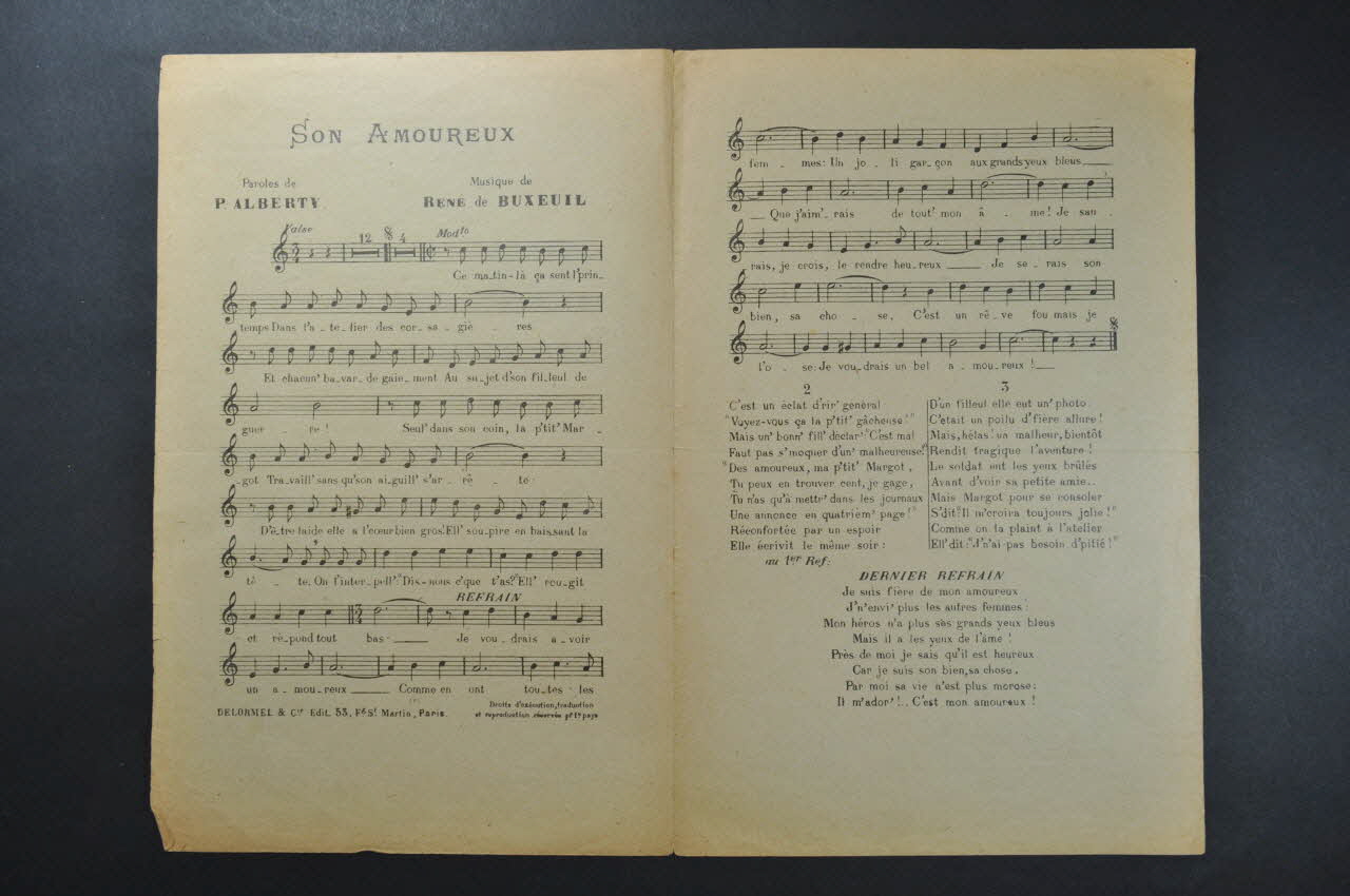 Les inscriptions renseignent le titre de la chanson, le nom des auteurs, de l'artiste et de l'éditeur. A l'intérieur, partitions et paroles de la chanson. Au dos, liste d?autres partitions publiées par l?éditeur.Décor