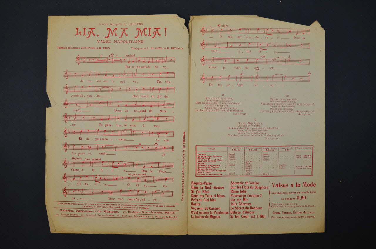 Feuillet rectangulaire en papier industriel imprimé. Le feuillet contient la partition et les paroles de la chanson. Au dos, publicité pour l'éditeur.Matériaux et techniques
