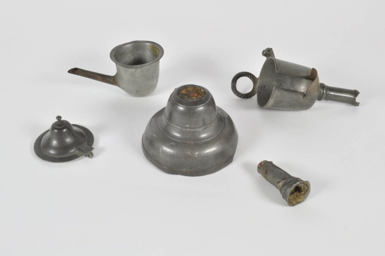 Godet de recupération cylindrique largement échancré à bec, muni d'une anse verticale. Godet d'éclairage cylindrique à bec en forme de goulot muni d'un couvercle en forme de cloche évasée, petit bouton de préhension.Décor
