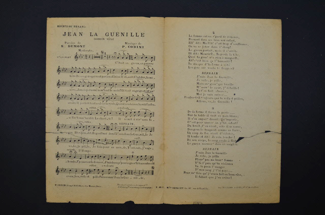 Feuillet rectangulaire en papier industriel imprimé. Le feuillet contient la partition et les paroles de la chanson. Au, dos, publicité pour l'éditeur.