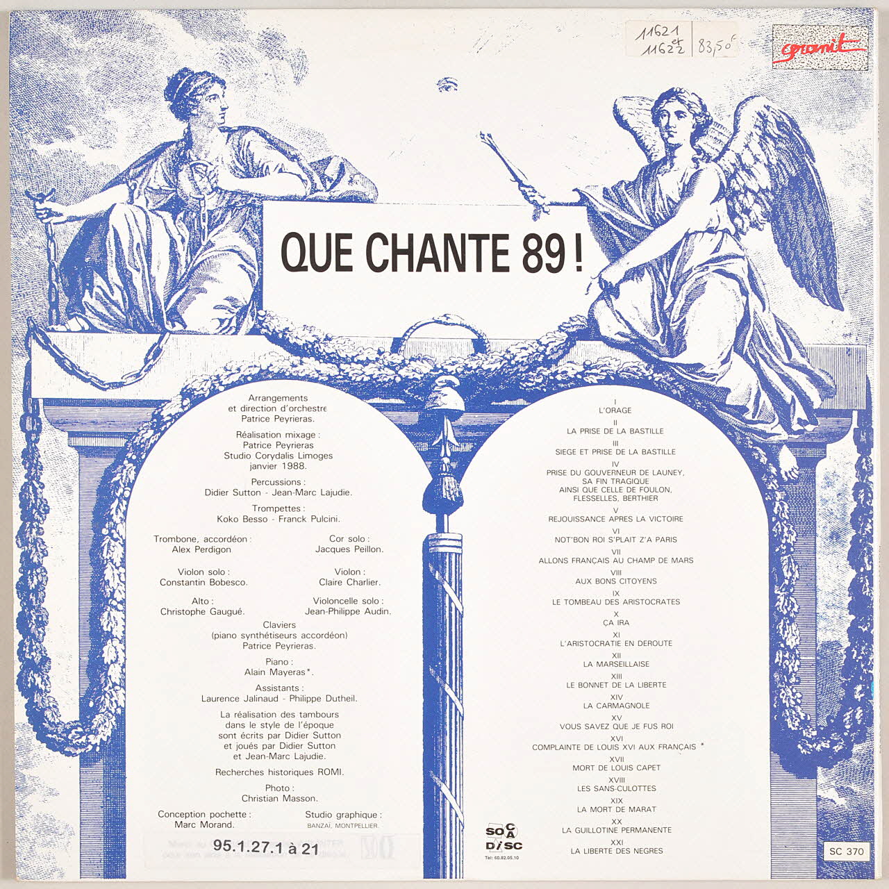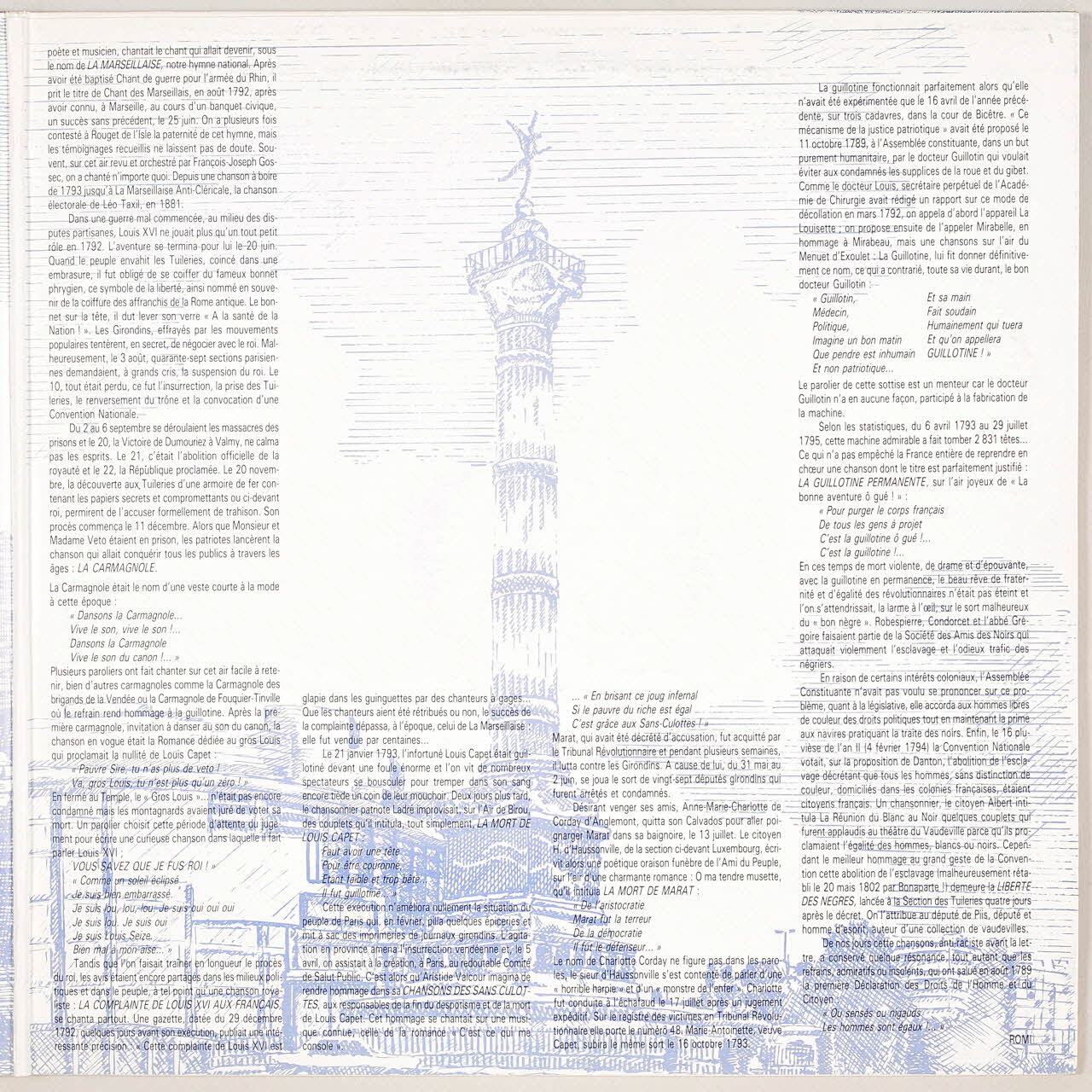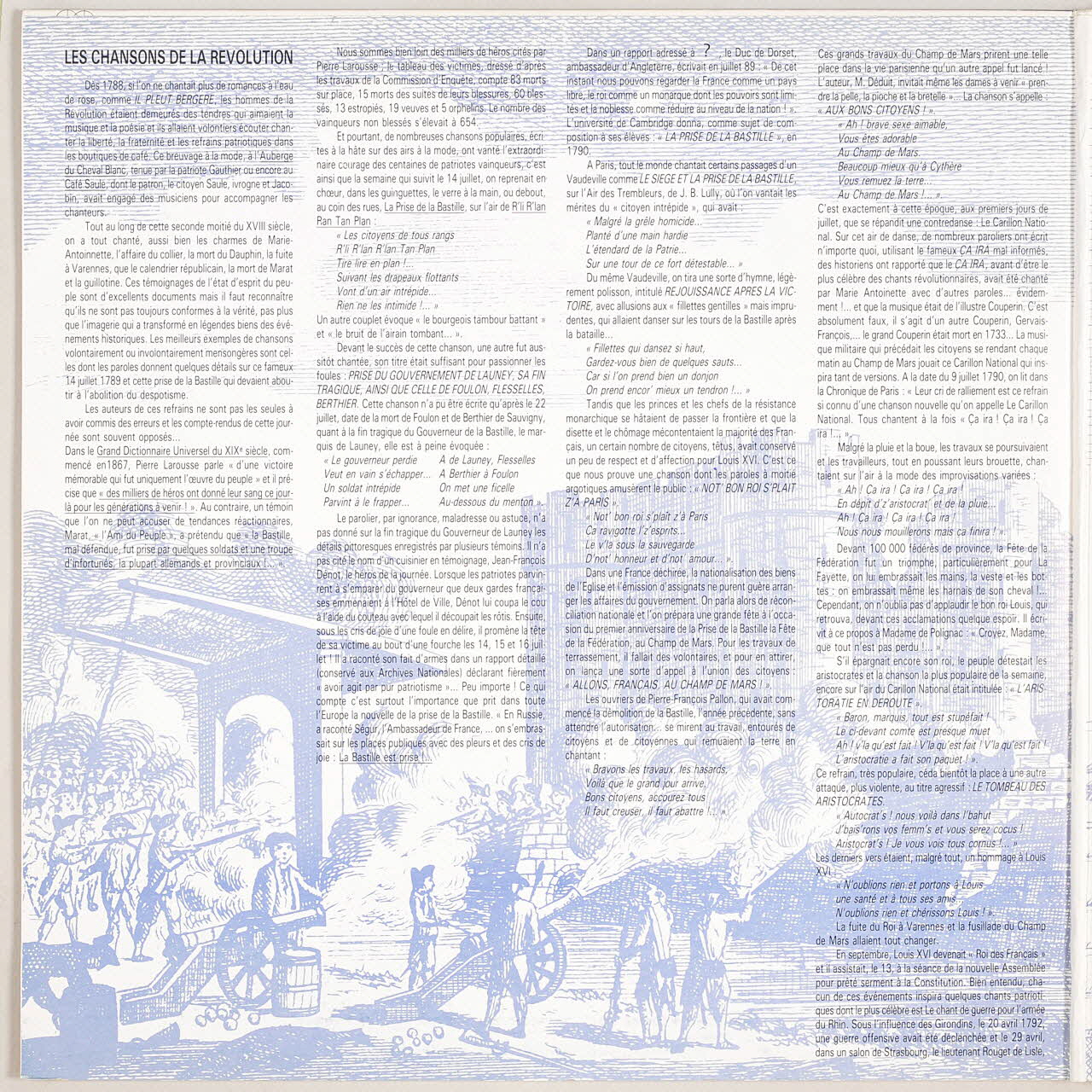 disque 33 tours, Le tombeau des aristocrates, La mort de Marat, Réjouissance après la victoire, Marc Ogeret chante la Révolution, Vous savez que je fus roi, La guillotine permanente, Complainte de Louis XVI aux Français, La liberté des nègres, L'aristocratie en déroute, La carmognole, Prise du gouverneur de Launey, sa fin tragique ainsi que celle de Foulon, Flesselles, Berthier, L'orage, Allons Français au champ de Mars, Ca ira, Le bonnet de la liberté, La Marseillaise, Les sans-culottes, Not'bon roi s'plait z'a Paris, LA PRISE DE LA BASTILLE, Aux bons citoyens, Mort de Louis Capet, Siège et prise de la Bastille
