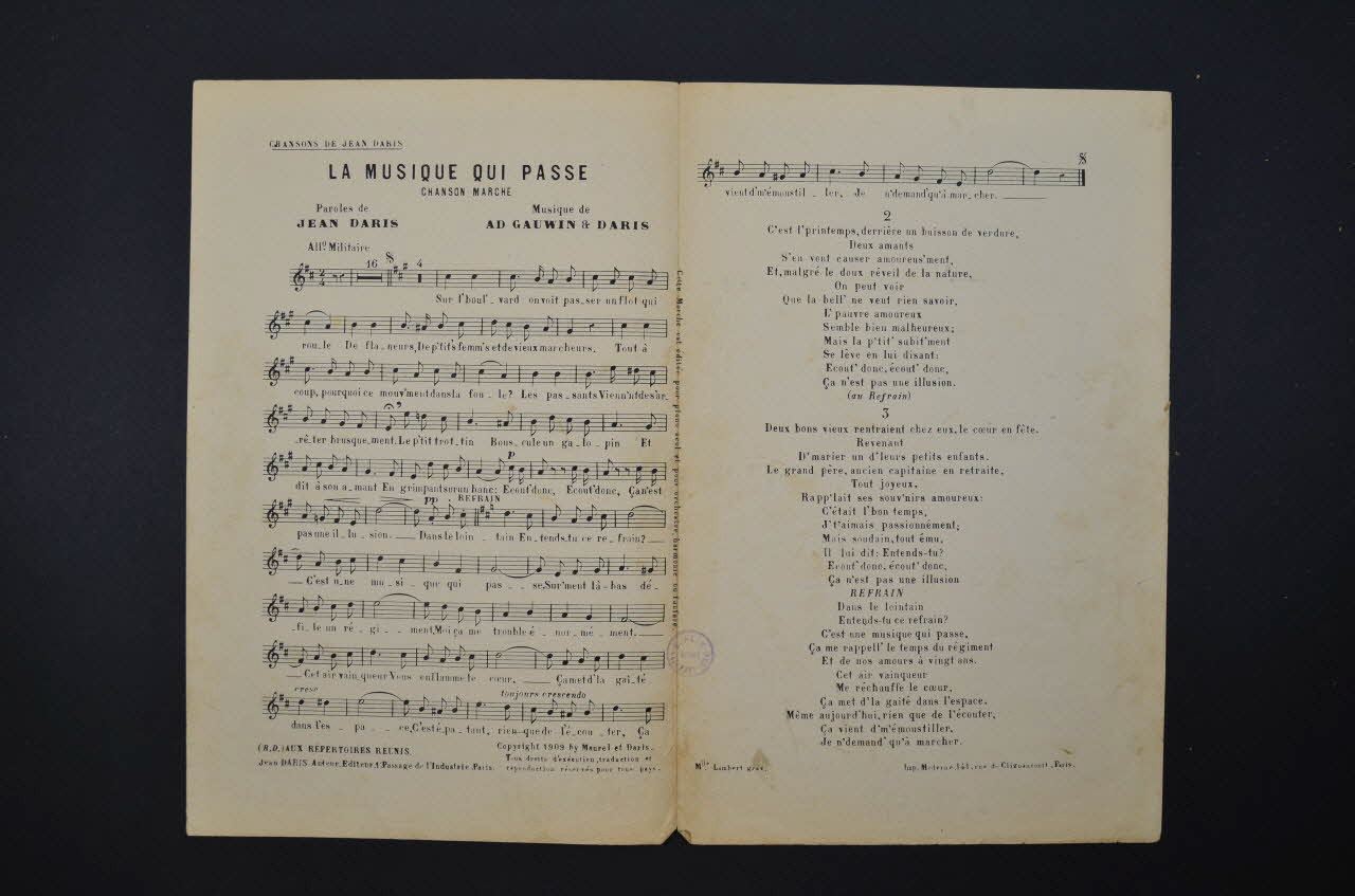 Feuillet rectangulaire en papier industriel imprimé. Le feuillet contient la partition et les paroles de la chanson. Au dos, publicité pour l'éditeur.