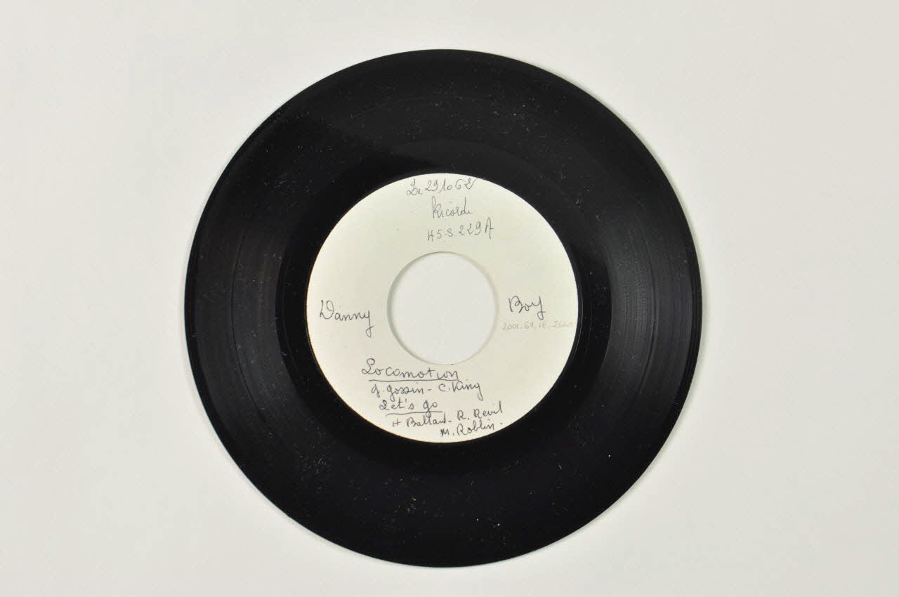 Ce disque en vinyle moulé noir présente une forme circulaire avec un évidement central. Des étiquettes en papier blanc sont collées sur les deux faces en partie centrale. Des inscriptions manuscrites au stylo noir donnent des indications sur les artistes et les titres.Matériaux et techniques