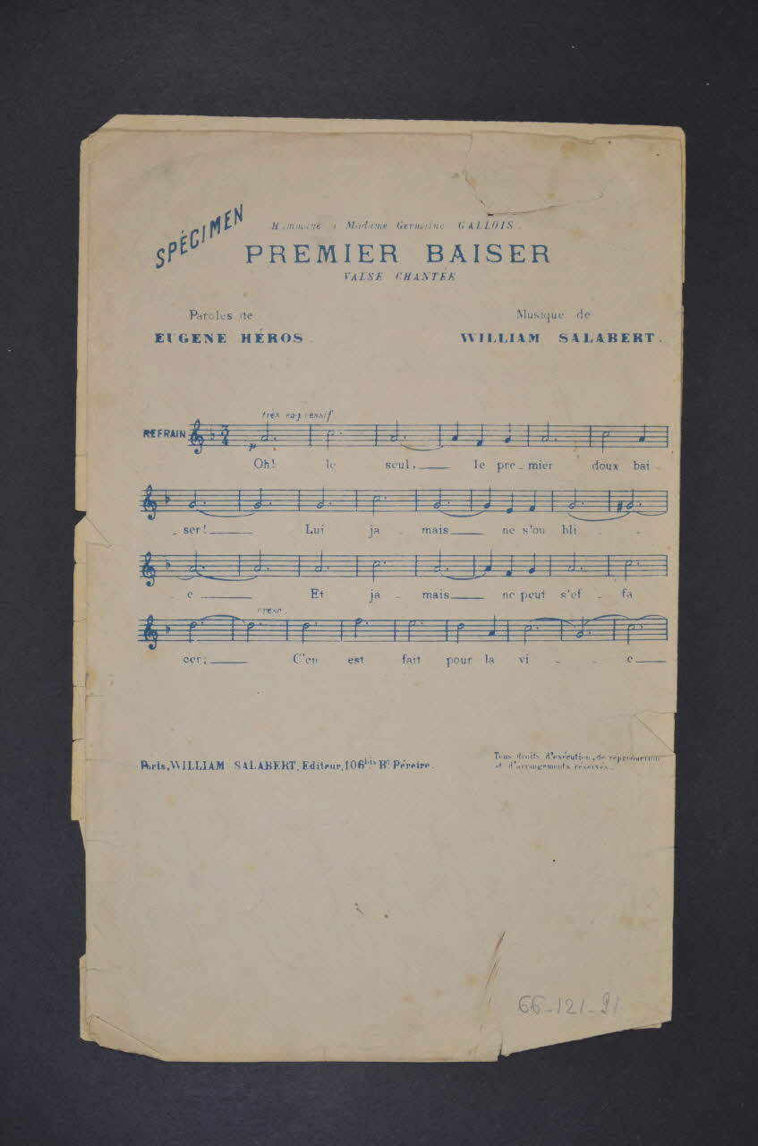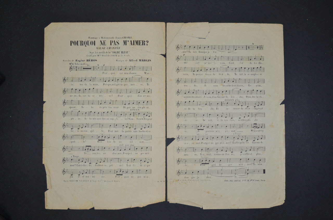 Les inscriptions renseignent le titre de la chanson, le nom des auteurs, de l'artiste et de l'éditeur. A l'intérieur, partitions et paroles de la chanson. Au dos, liste d?autres partitions publiées par l?éditeur.Décor
