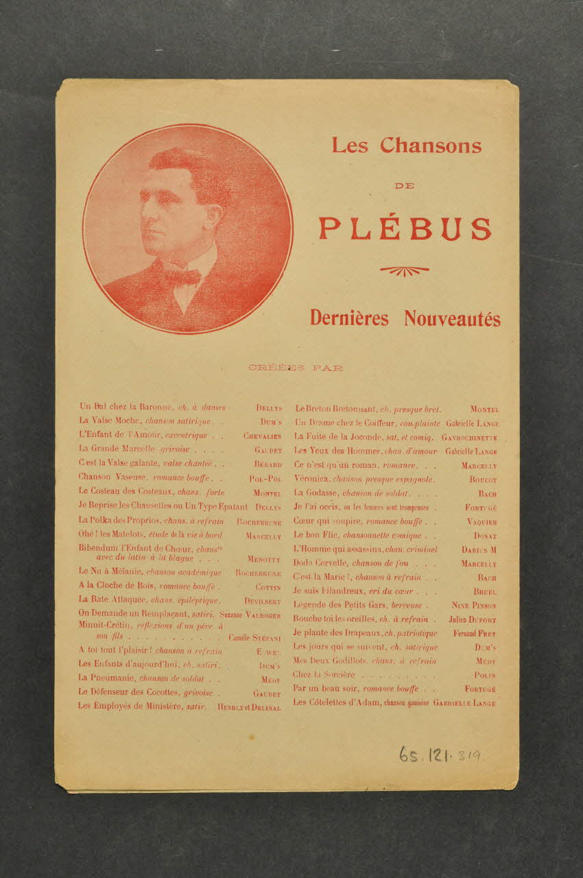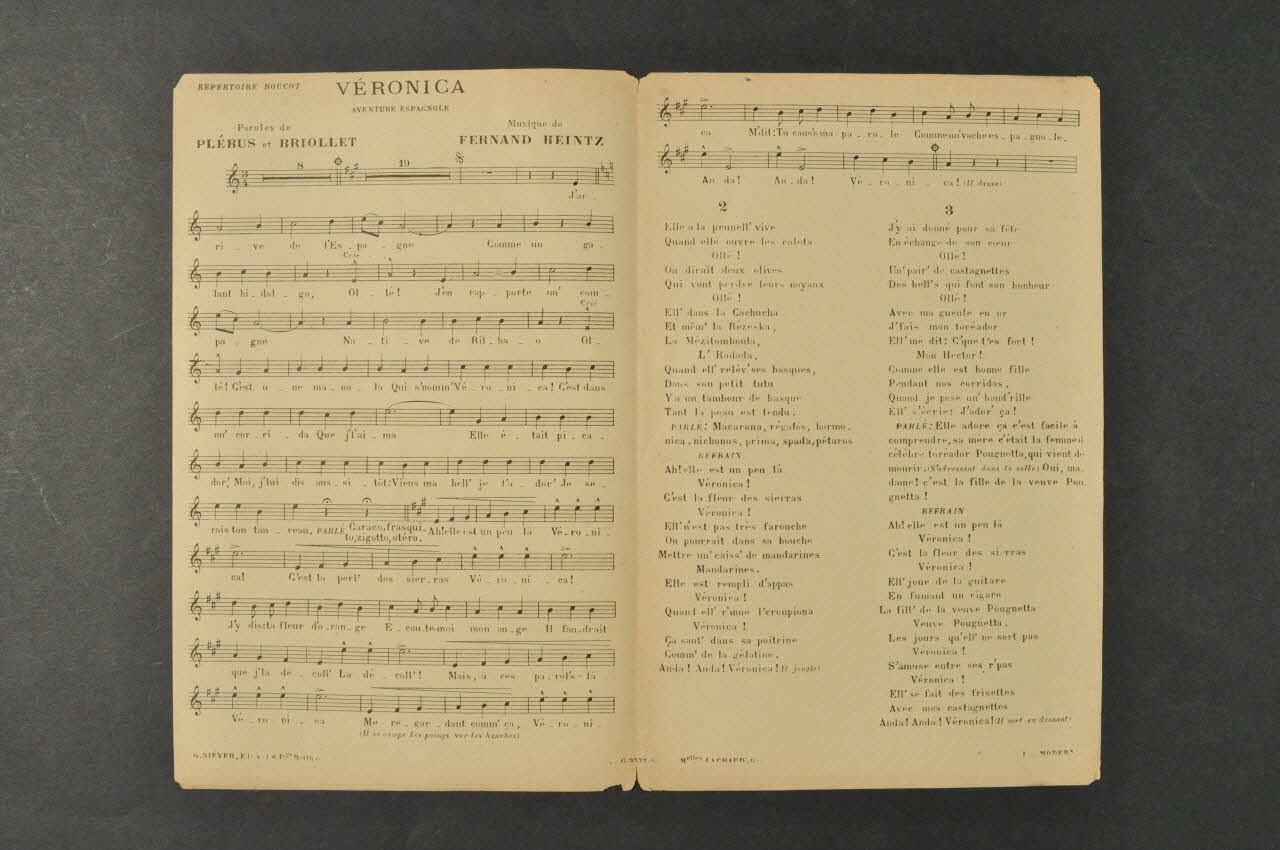 Des inscriptions renseignent le titre, les auteurs, les exécutants et l'éditeur. A l'intérieur, partition et paroles de la chanson. Au dos, liste d'autres partitions publiées par l'éditeur.Matériaux et techniques