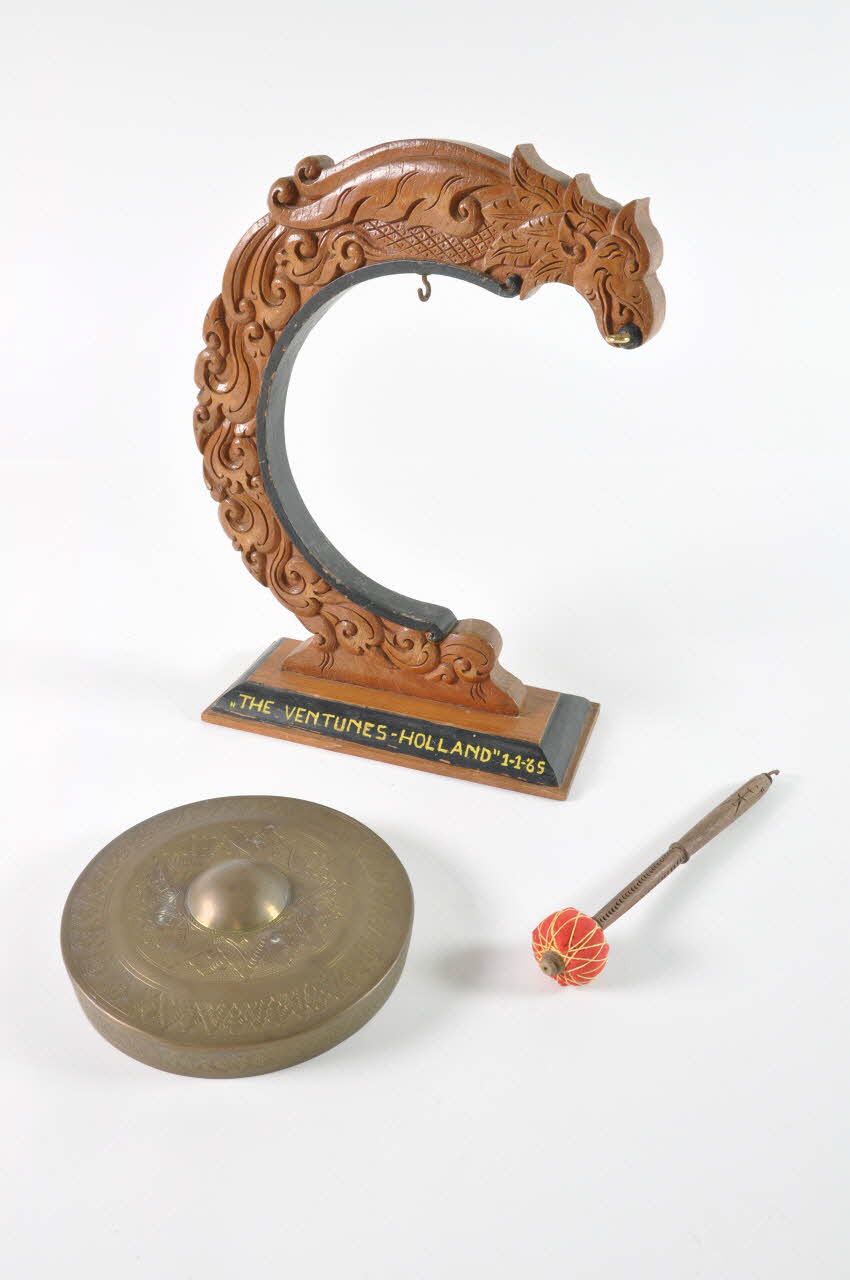 A la partie supérieue, deux crochets en fer dont un doré, permettent de soutenir le gong au centre et le battant dans la bouche du dragon.
